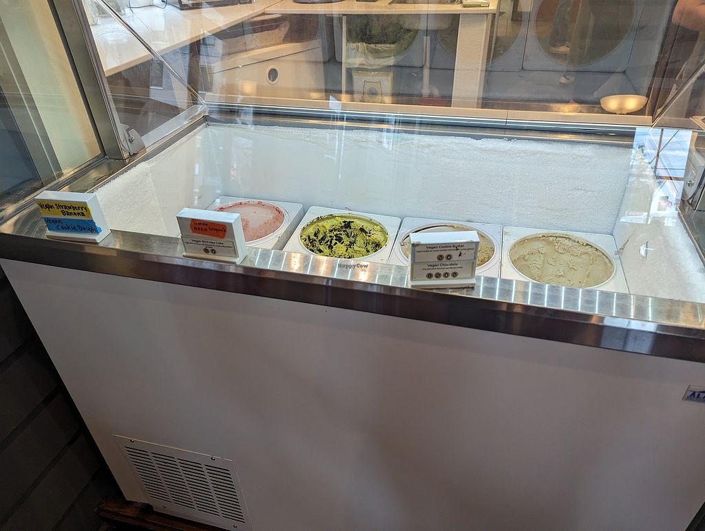Cute little ice cream shop with 4 Vegan flavors. Vegan Raspberry Sorbet, Began Birthday Cake, Vegan Vanilla, and Vegan Chocolate.