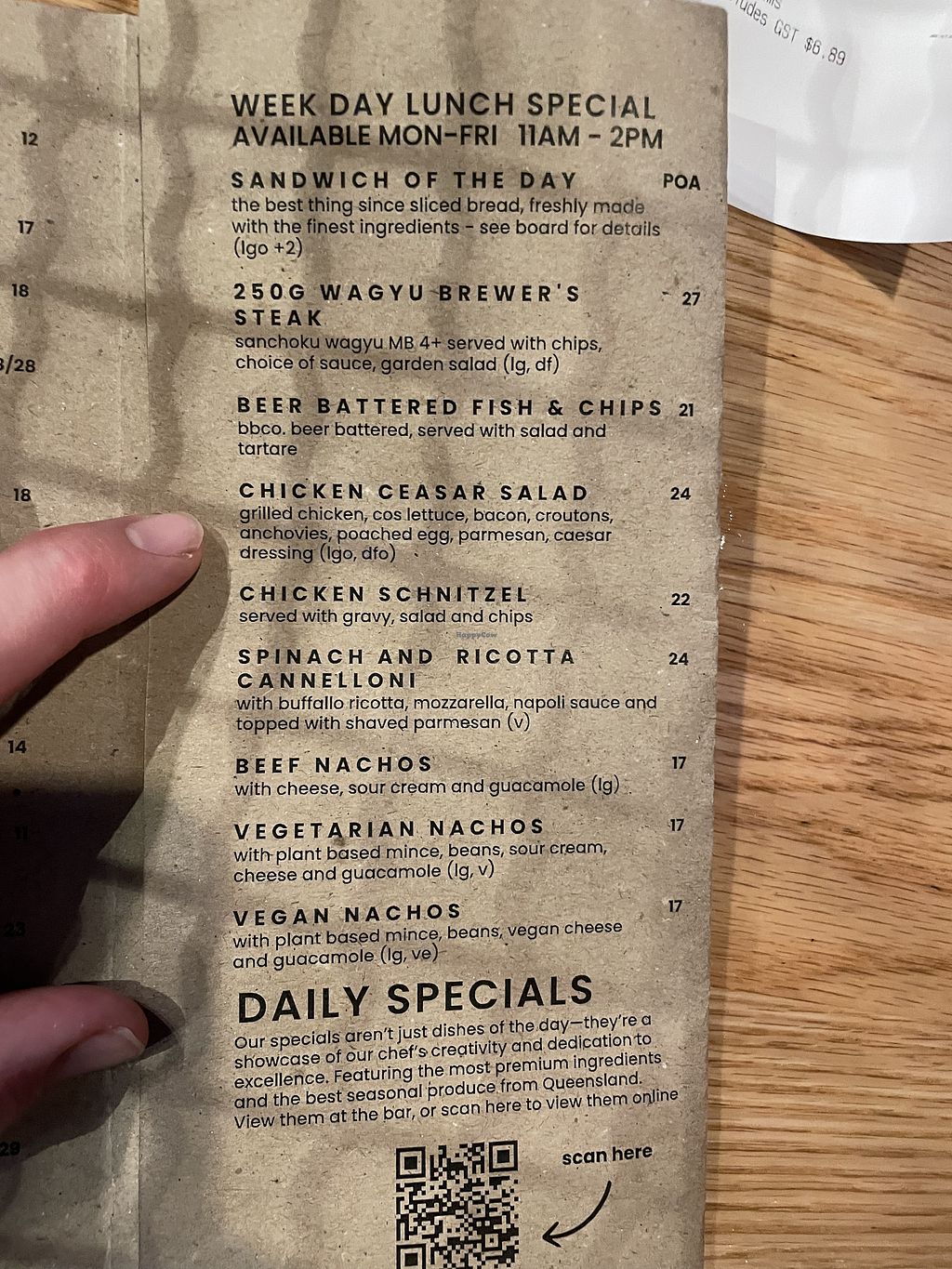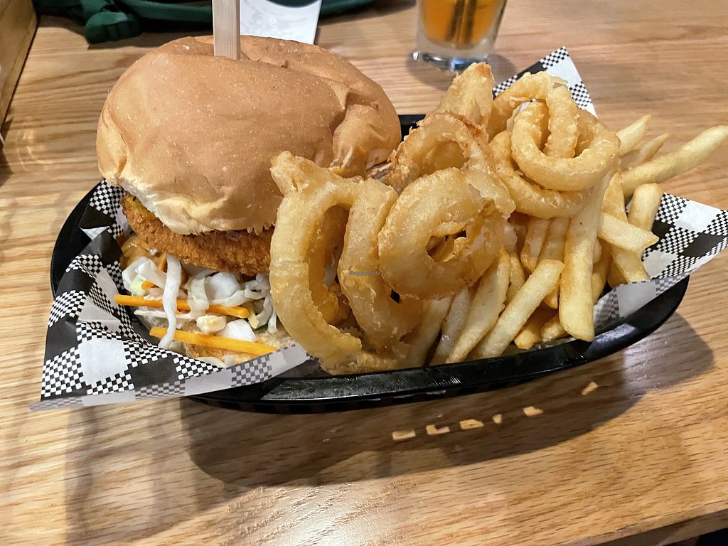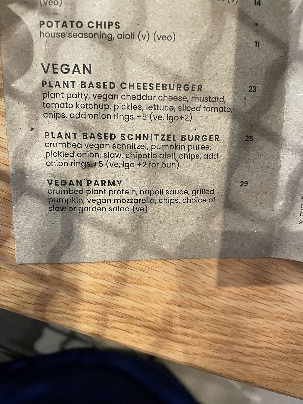 Serves meat, vegan options available. Brewery and pub with clearly labeled food menu. Example offerings include potato chips, vegan burgers, soy parm and more. Open Mon-Thu 10:00am-11:00pm, Fri-Sat 10:00am-1:00am, Sun 10:00am-11:00pm.