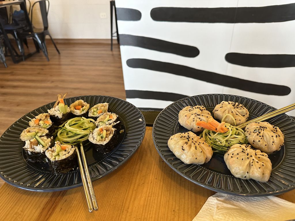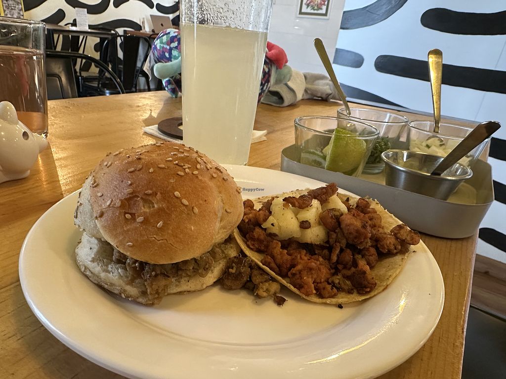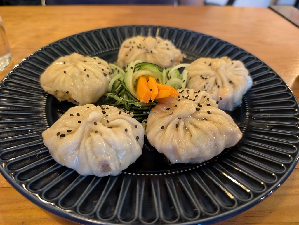 There are two types of dumplings served of the 5 on the plate (one veg and tofu, the other soya and cabbage). We also ordered a cemita (a Pueblan sandwich roll covered in sesame seeds) which has milanesa vegan meat, tomato, and avocado. Both were very tasty. Service was friendly too 😊