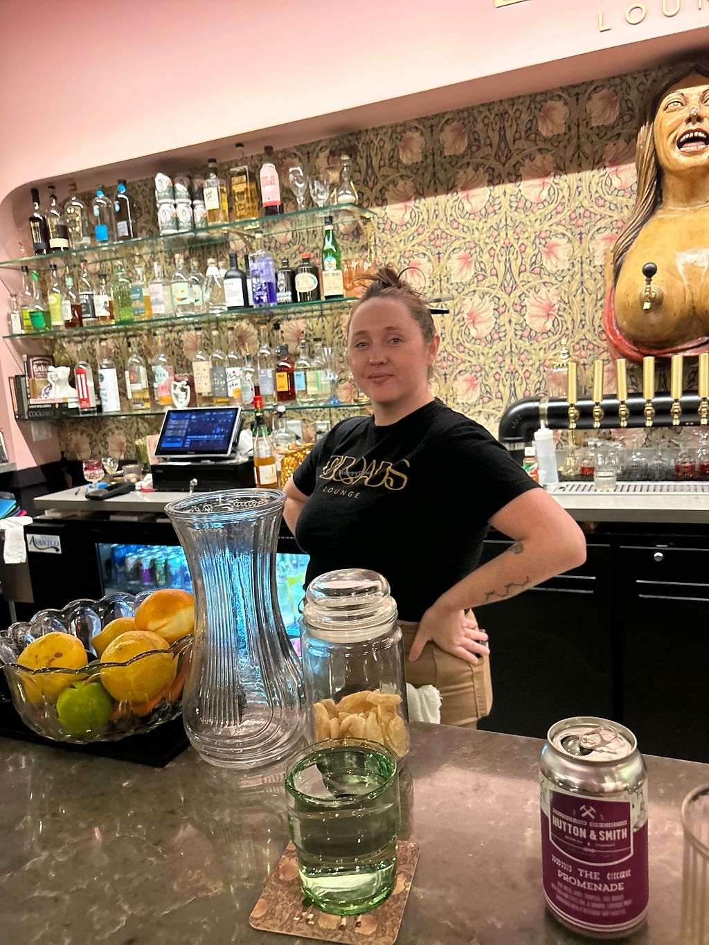 Serves meat, vegan options available. Female-forward bar offering many items that can be made vegan such as whipped ricotta, French dip sliders, 'chicken' salad, pimento cheese, flatbread, roast potatoes and lemon raspberry cake. Open Mon-Sun 4:00pm-12:00am.