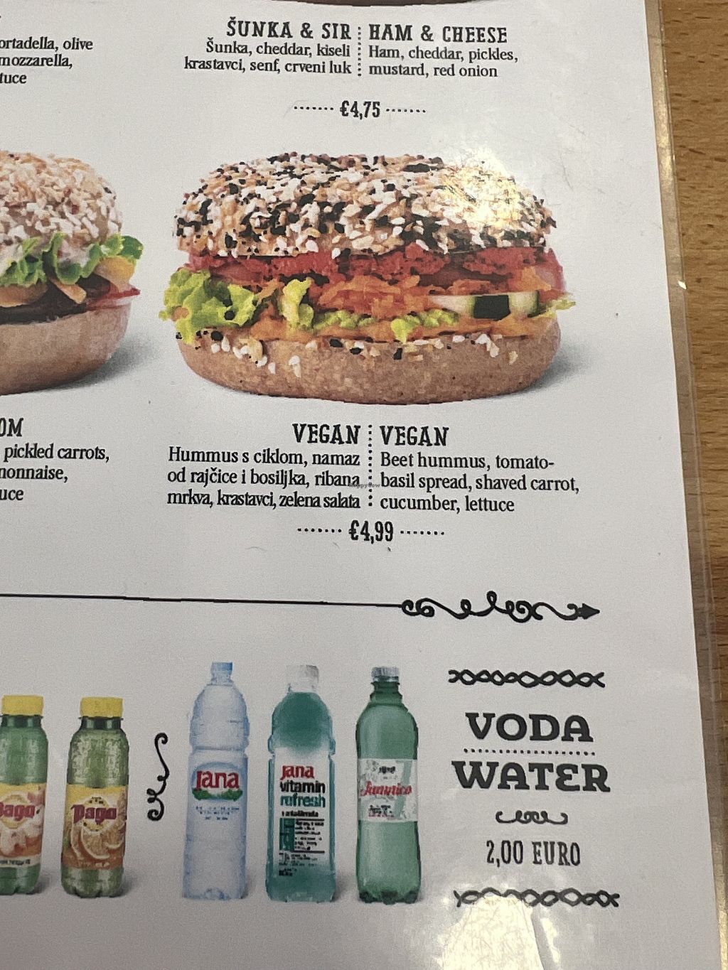 I had the vegan bagle as I was very hungry and in a rush. It's not worth 35 kuna though as it's not tasty at all. Probably healthy though.