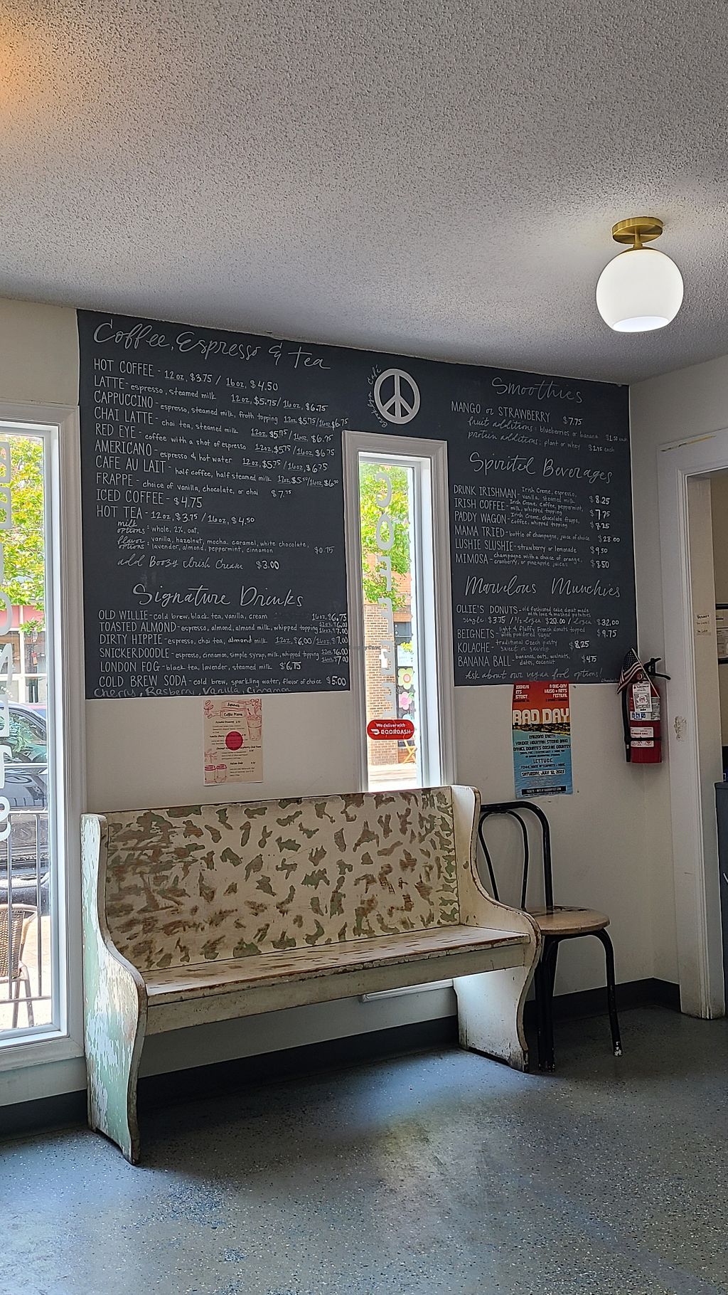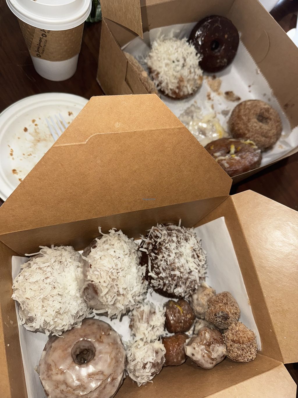 Vegan Coconut and Vegan Lemon donuts with a vegan Toasted Almond coffe…