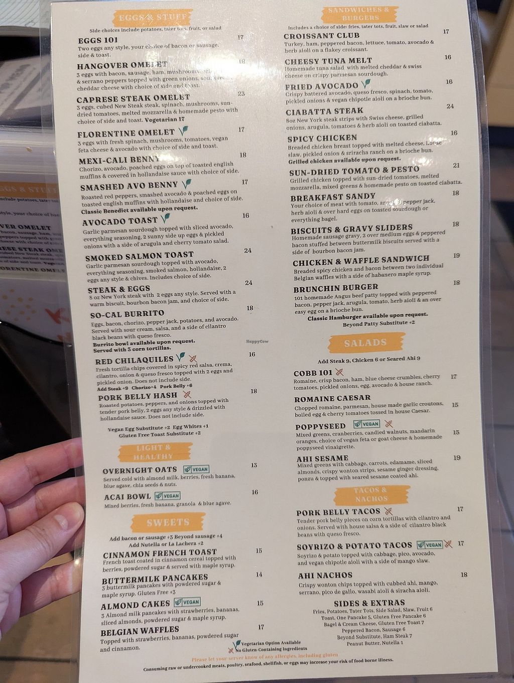 Several vegan menu options including Almond Cakes, Overnight Oats, Acai Bowl, Poppyseed Salad, and Soyrizo & Potato Tacos. All of the vegetarian egg dishes can be made vegan by substituting Just Egg. The Florentine Omelet even included vegan feta. Beyond sausage is also available as a side substitute.