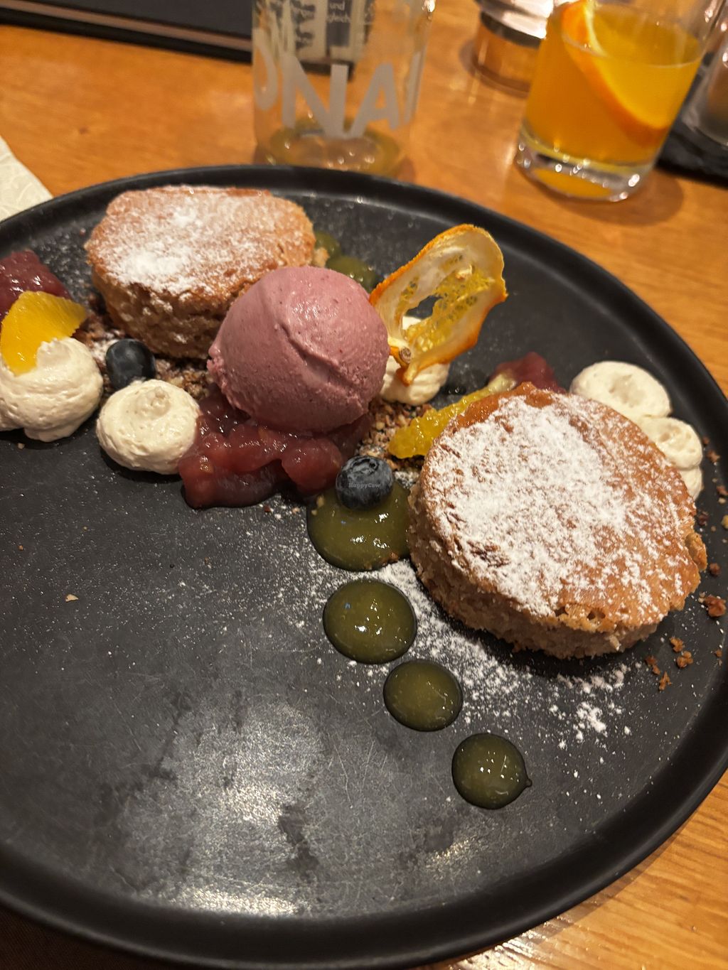 Sweet potatoe cake with ice and fruits