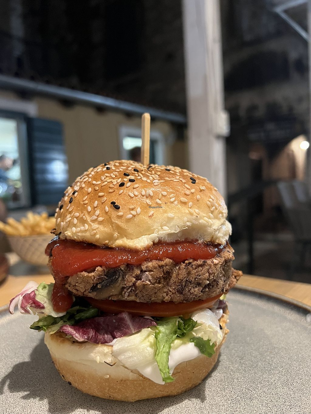We are here with a vegan cruise group of 21 people and enjoyed the food, atmosphere, and local beers and wines. They offer a homemade vegan veggie burger that is huge and delicious, served with a large side of sweet potato fries that were fresh and tasty. We were seated in a beautiful medieval courtyard in the UNESCO protected area of Trogir.