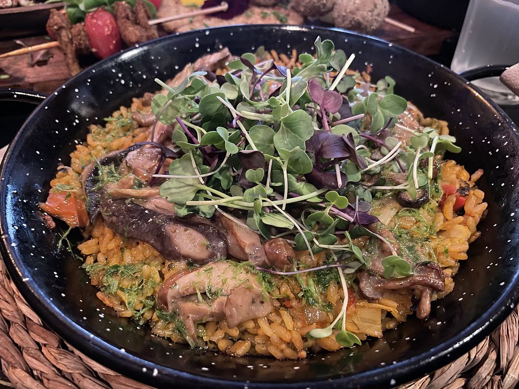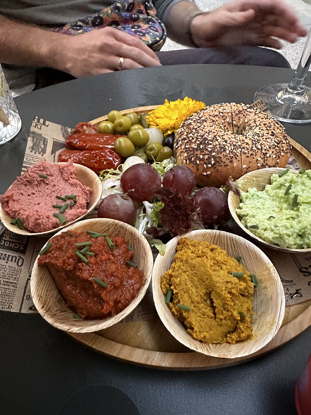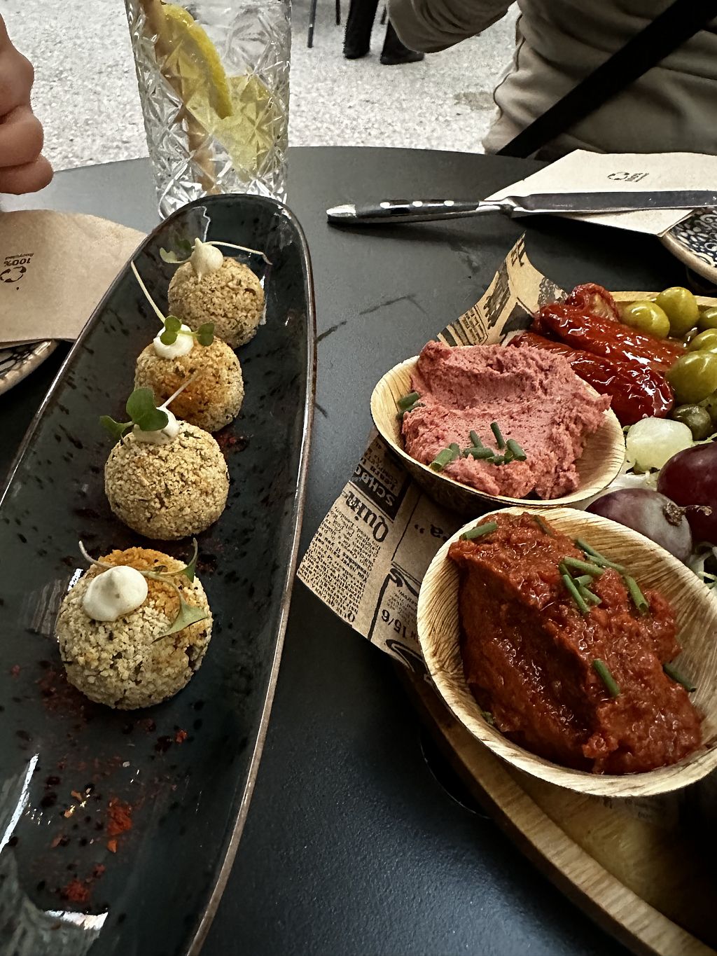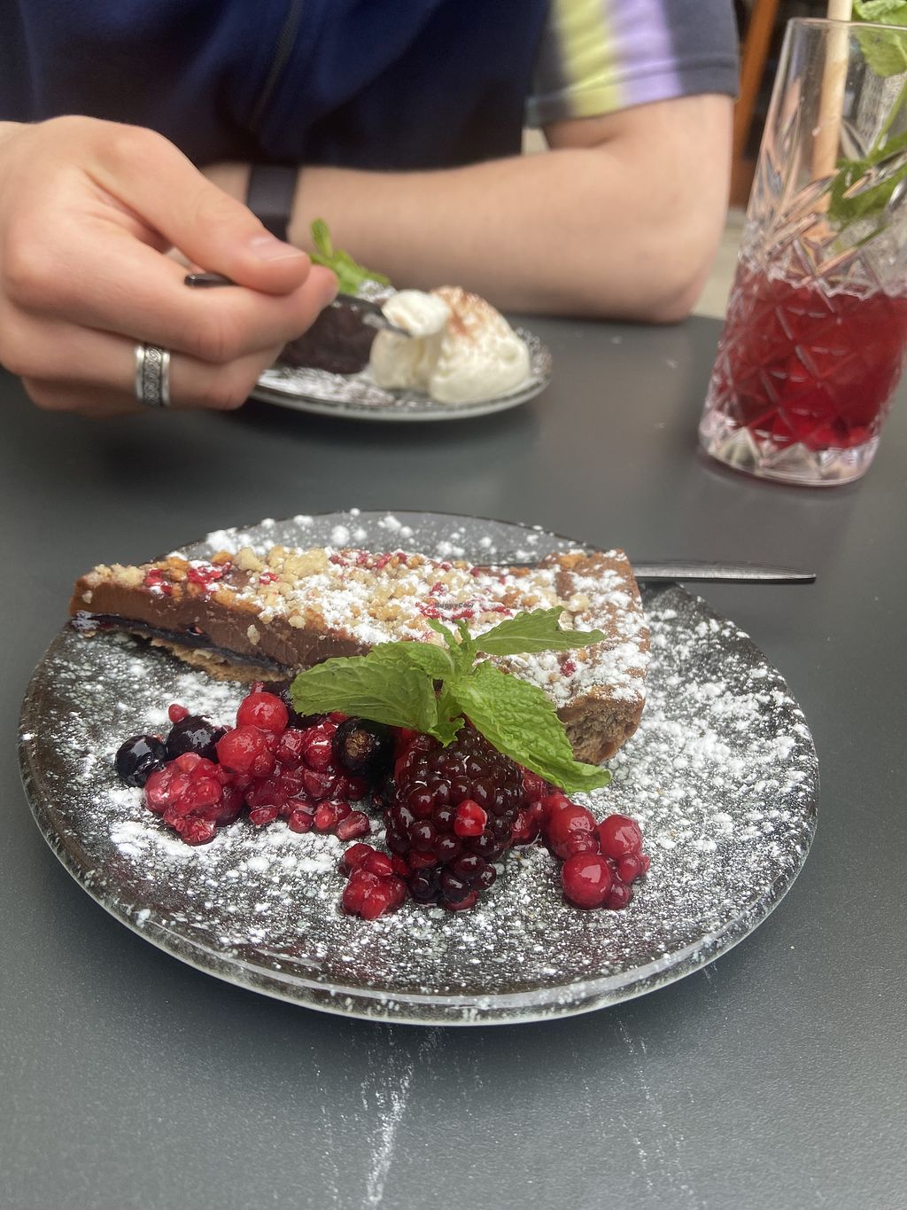 Pancakes with fruit, without roasted nuts, syrup in the jug. Chicken b…