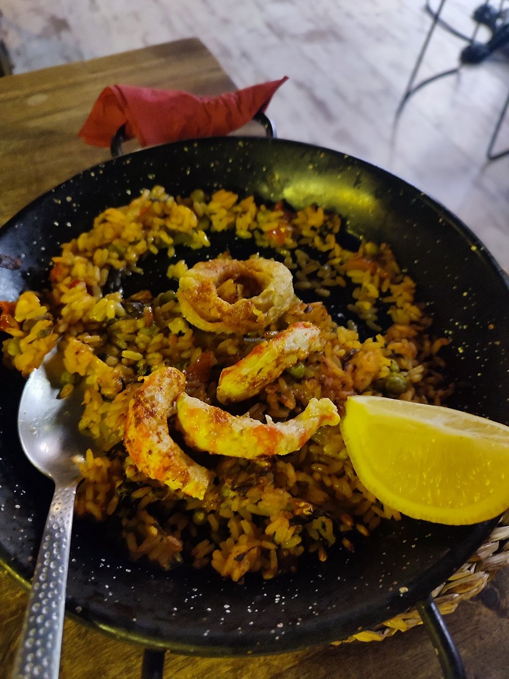 The paella tasted like it’s been warmed up 20 times that day, the calamari was unfortunately not crispy at all. It was eatable but I won’t some again. Very nice service tho!