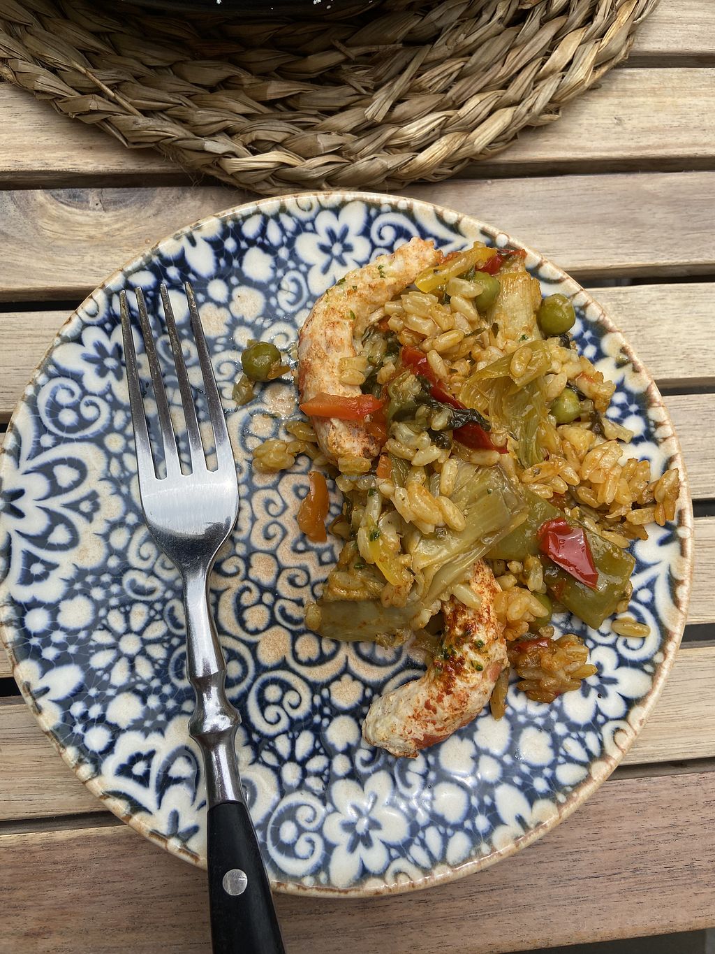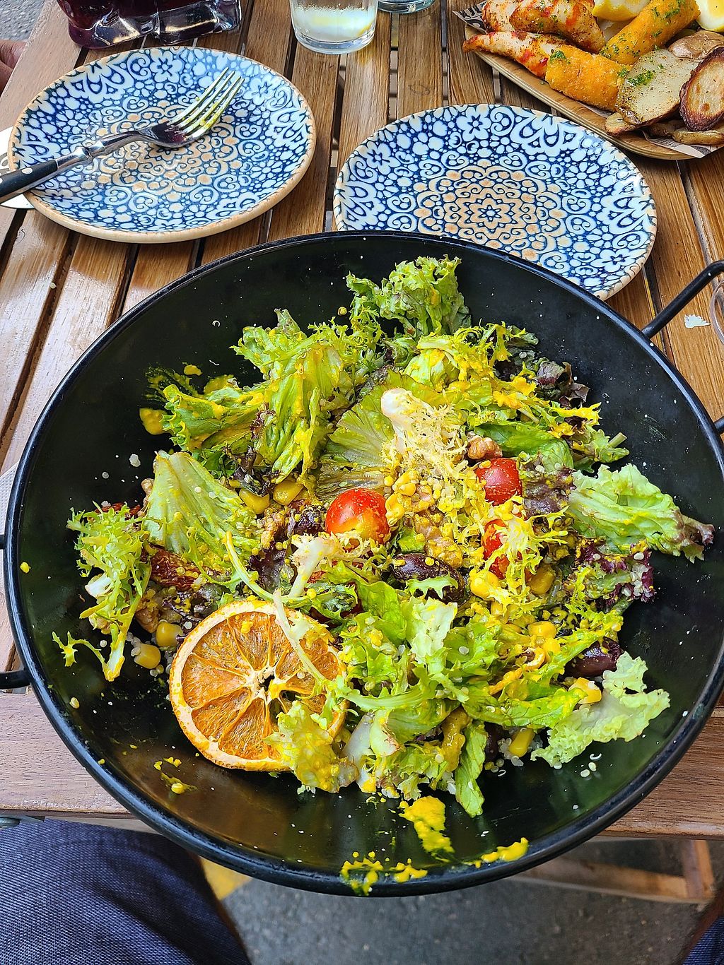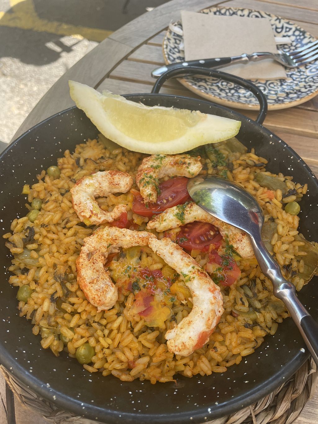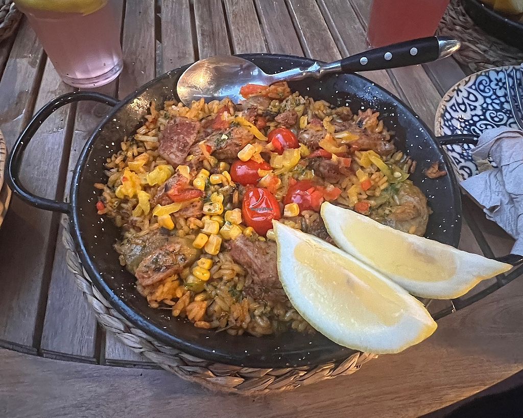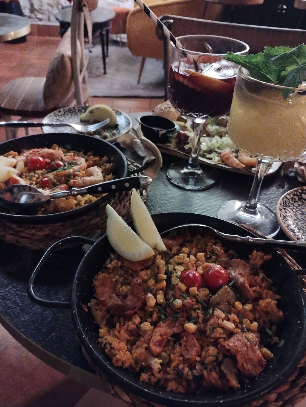 We shared the vegan seafood paella, which was €14,50. We also had bread with hummus, which we were only charged €2,50 for so that was nice. The drinks are very nice as well, we tried the homemade passionfruit lemonade and the basil rose sangria. Nice terrace, kind staff. The food just didn’t blow us away, so that’s why it’s not 5 stars.