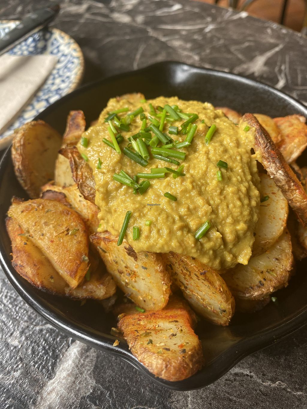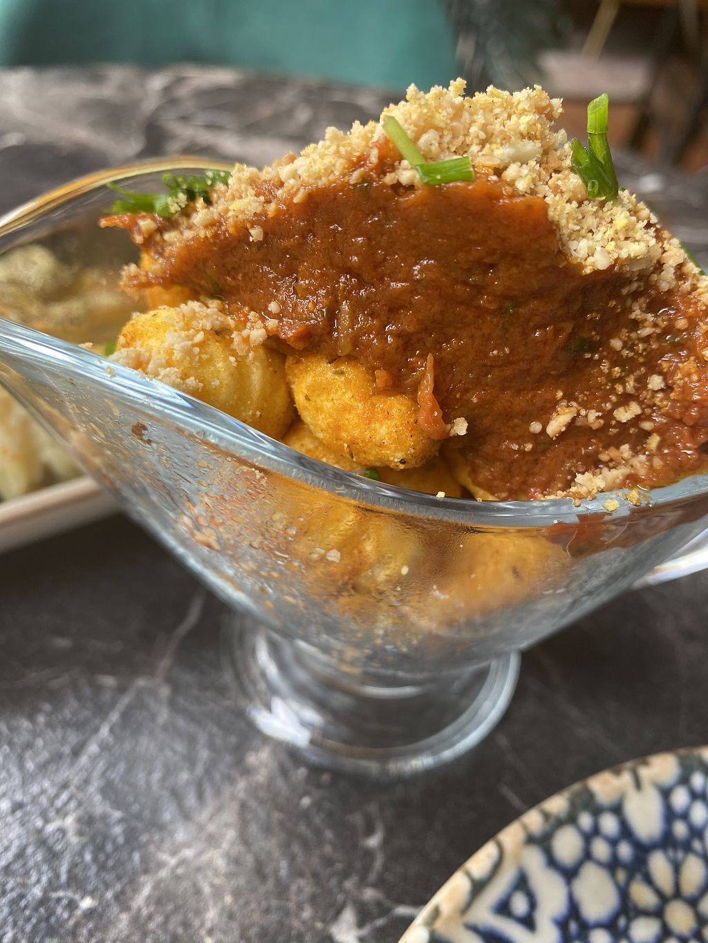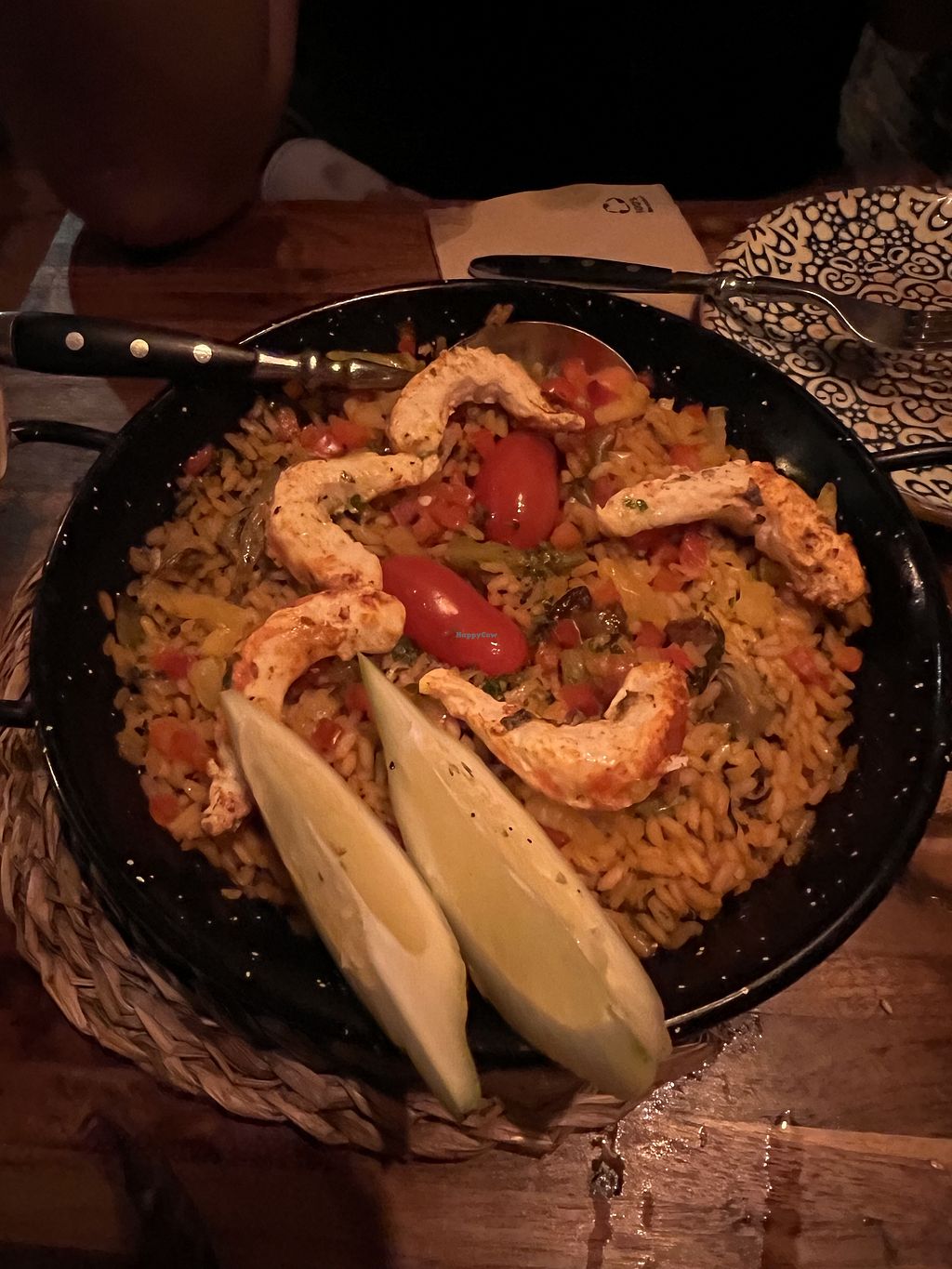 Had their seafood paella and loved it. Had never had vegan seafood so the shrimp was a nice surprise, I liked the texture and taste. The paella itself was very tasty, warm and a comforting meal. We also tried croquettes which weren’t what I expected but very mushroomy which is a plus and overall also delicious . The loaded gnocchi tasted homemade and very comforting. The staff was friendly and had a good nighttime vibe. The sangrias were also good and there was a variety to choose from.