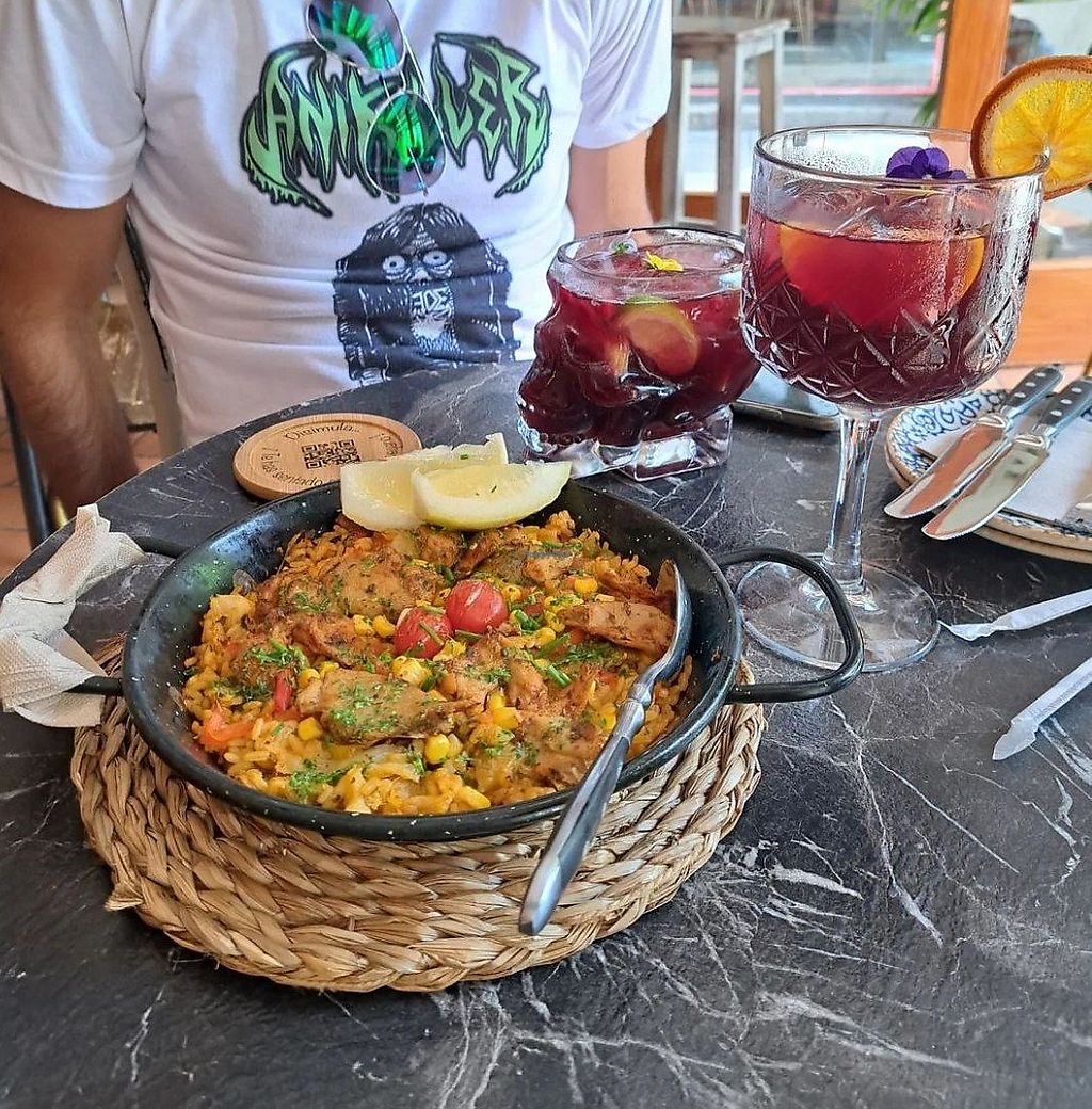 Vegan Sangria bar with a nice selection of sangria wines. Also the food is very good. We had the sea food platter as starter and a paella as main dish.