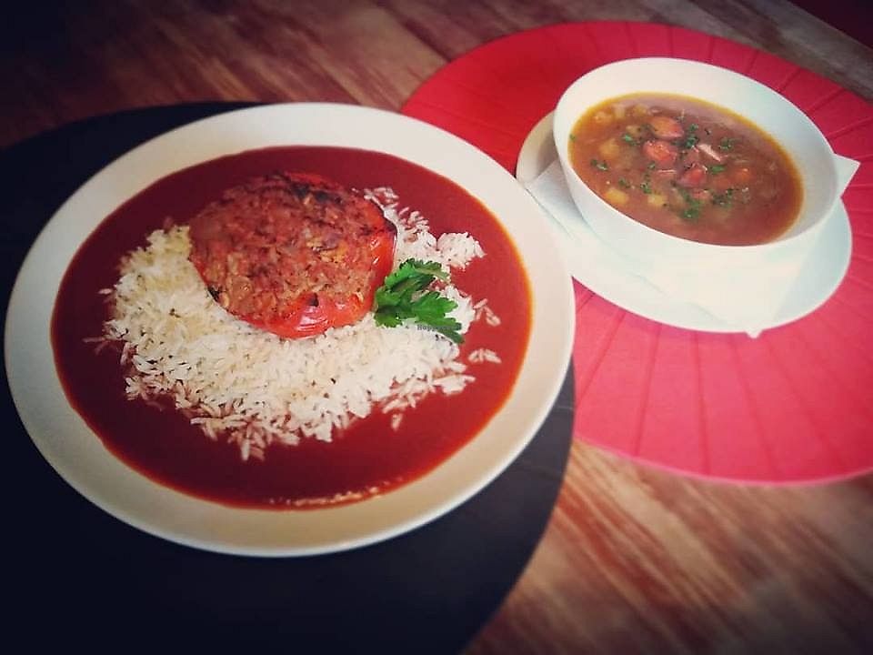 a vegan pub is a rare beast :-). with a small outside seating. the have just some 4-5 pub style dishes (burger, vegan fried cheese,...), playing rock music and the beer is cheap, what else to wish ;-). Lunch menu of soup and one main dish (also over weekends) at 12-15 o'clock available.