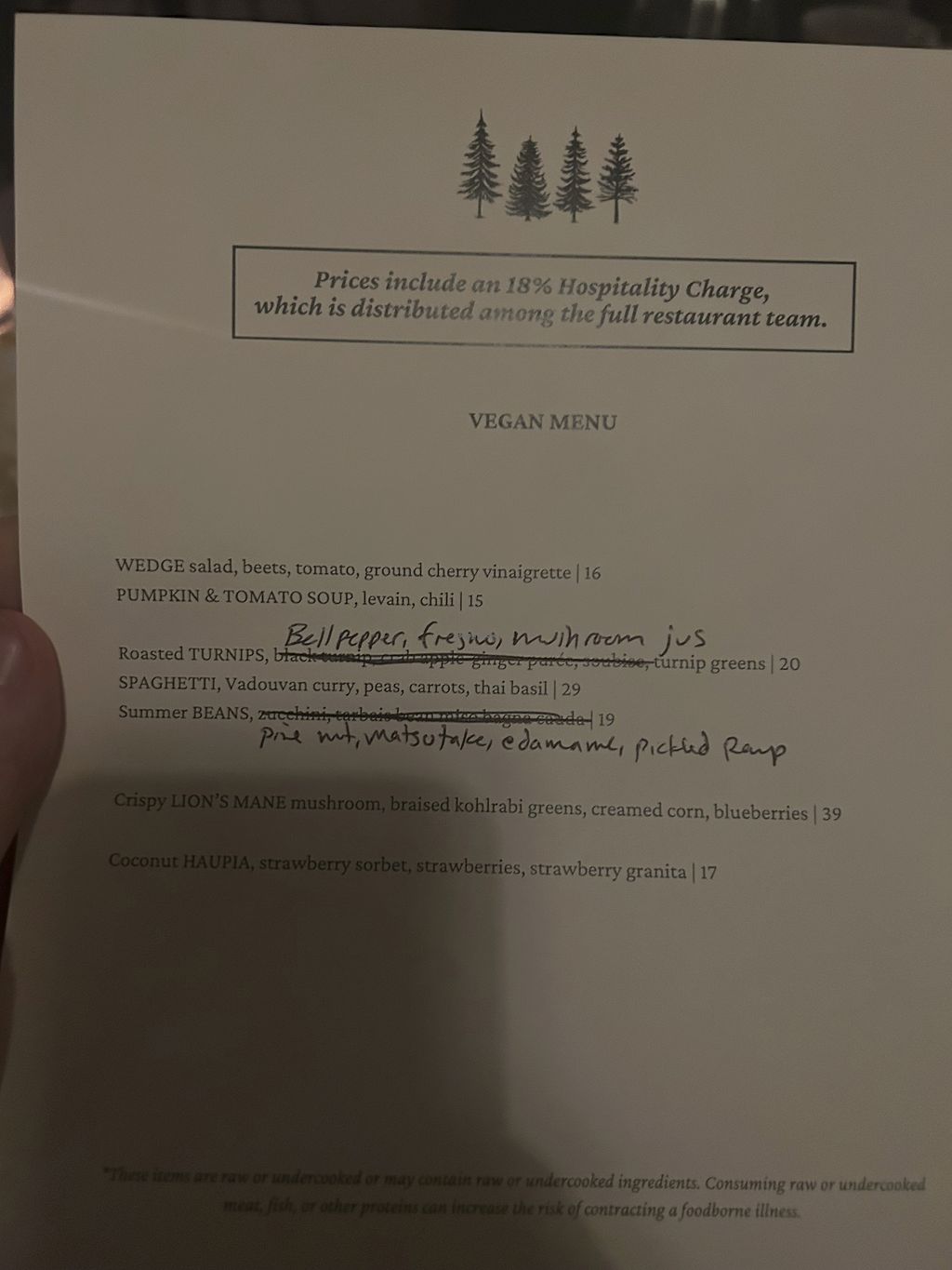 Surprised this restaurant, which won the James Beard award for best new restaurant, had a fully vegan menu! And everything was excellent. Stuff like the mushroom main dish, which I would normally shy away from, turned out great. The dessert was delish as well. And server knew exactly what was vegan and had good suggestions and recommendations.