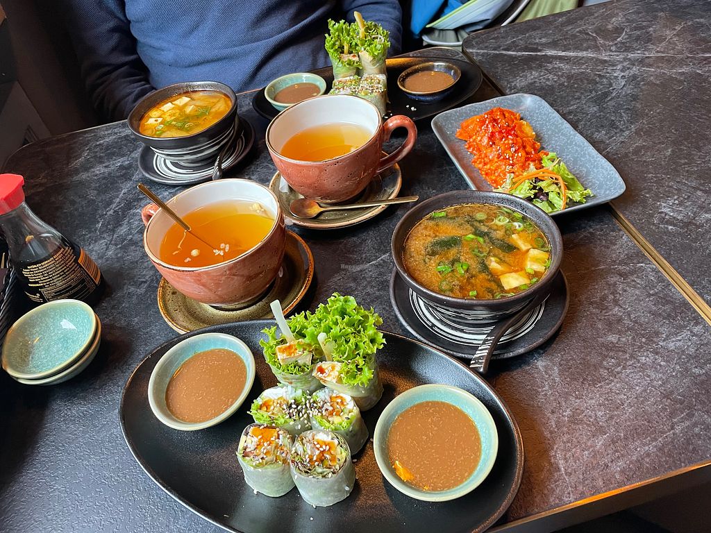 Different Starters: Summer rolls, soup, Gyoza and Jasmine Tea