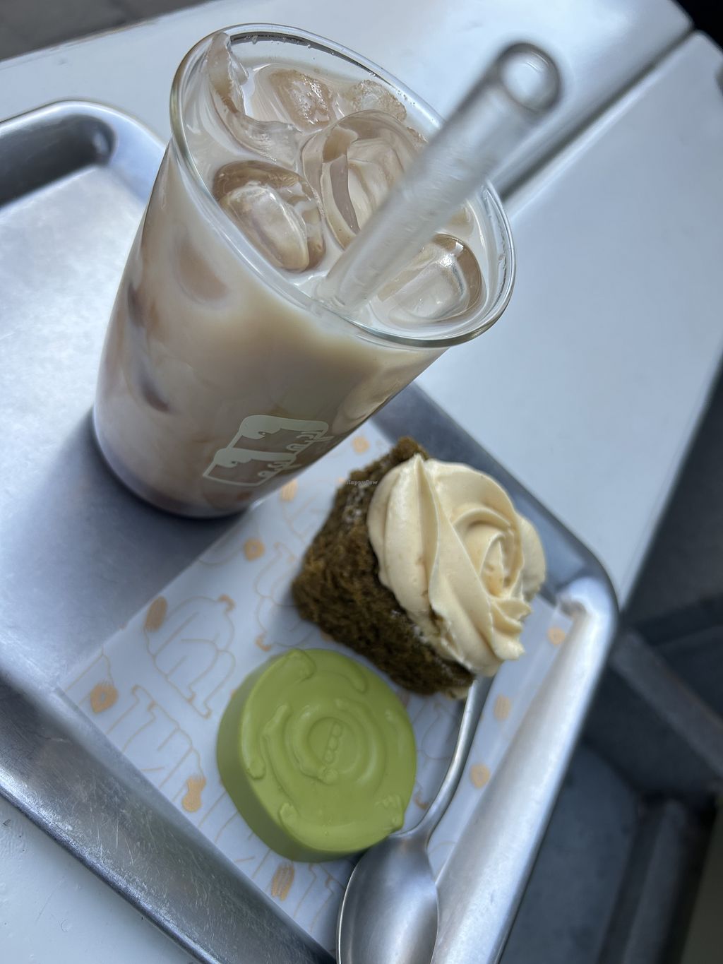 Delicious decaf iced peanut butter coffee. The coconut carrot cake was also very tasty.