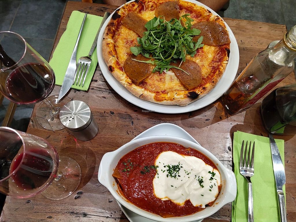 Delicious textures in the pizza and lasagna. The wine is good too
