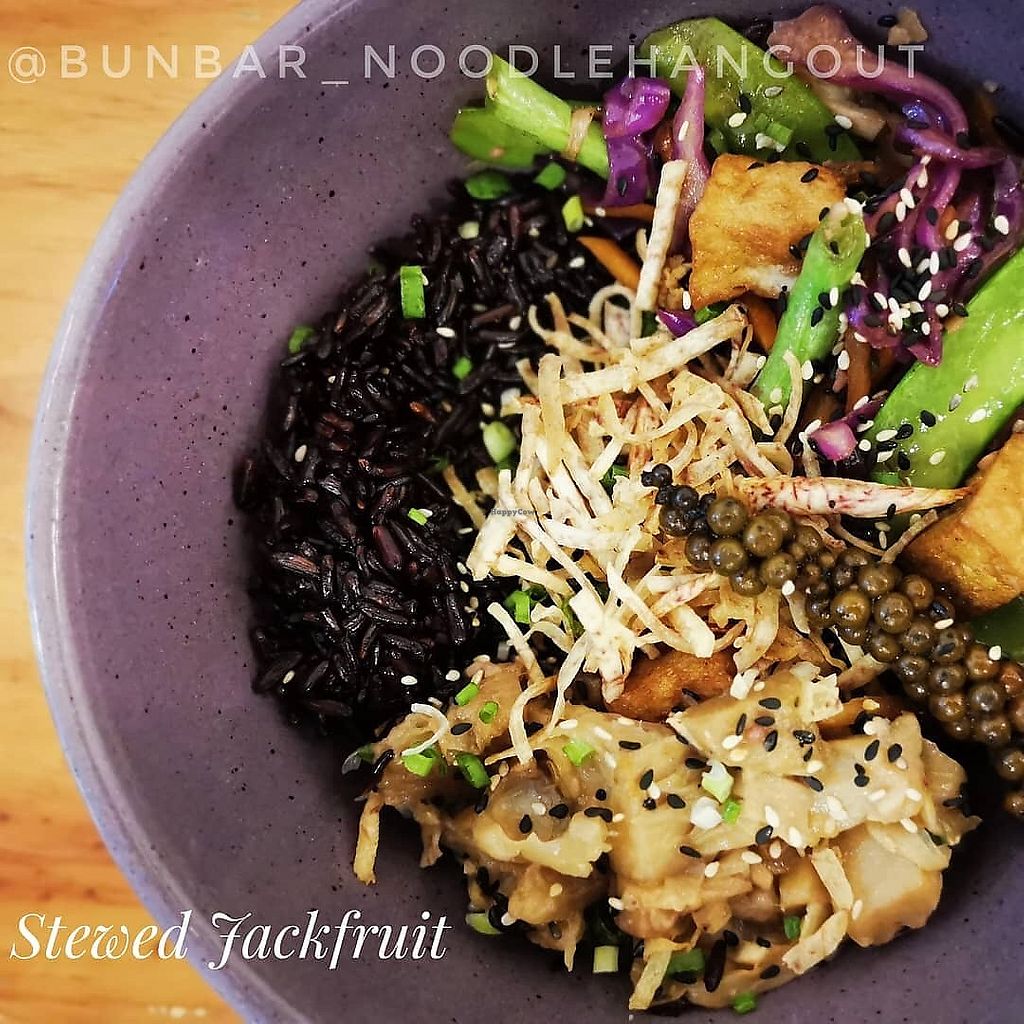 Black rice with jackfruit stew and sautéed veggies and tofu