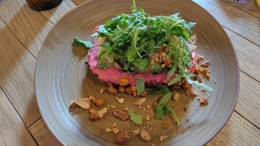 I had the cauliflower beetroot hummus from the lunch menu which was basically a chunky piece of bread topped with beetroot hummus, a few cold (and therefore not crispy anymore) deep fried pieces of cauliflower, pickled cucumber, rocket and smokey almonds/chickpeas.
