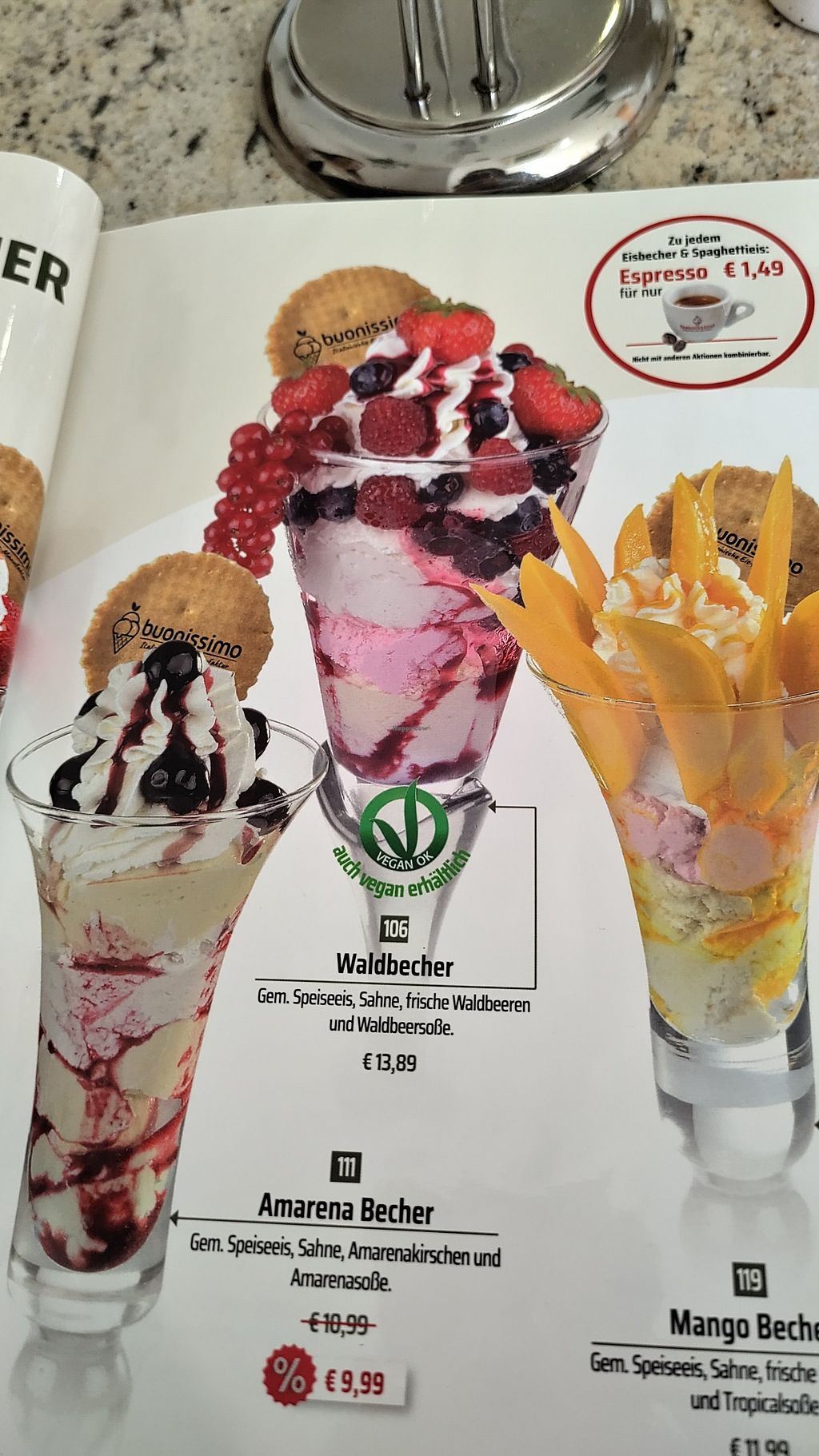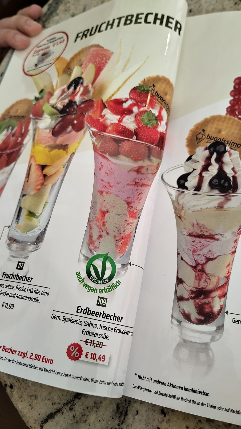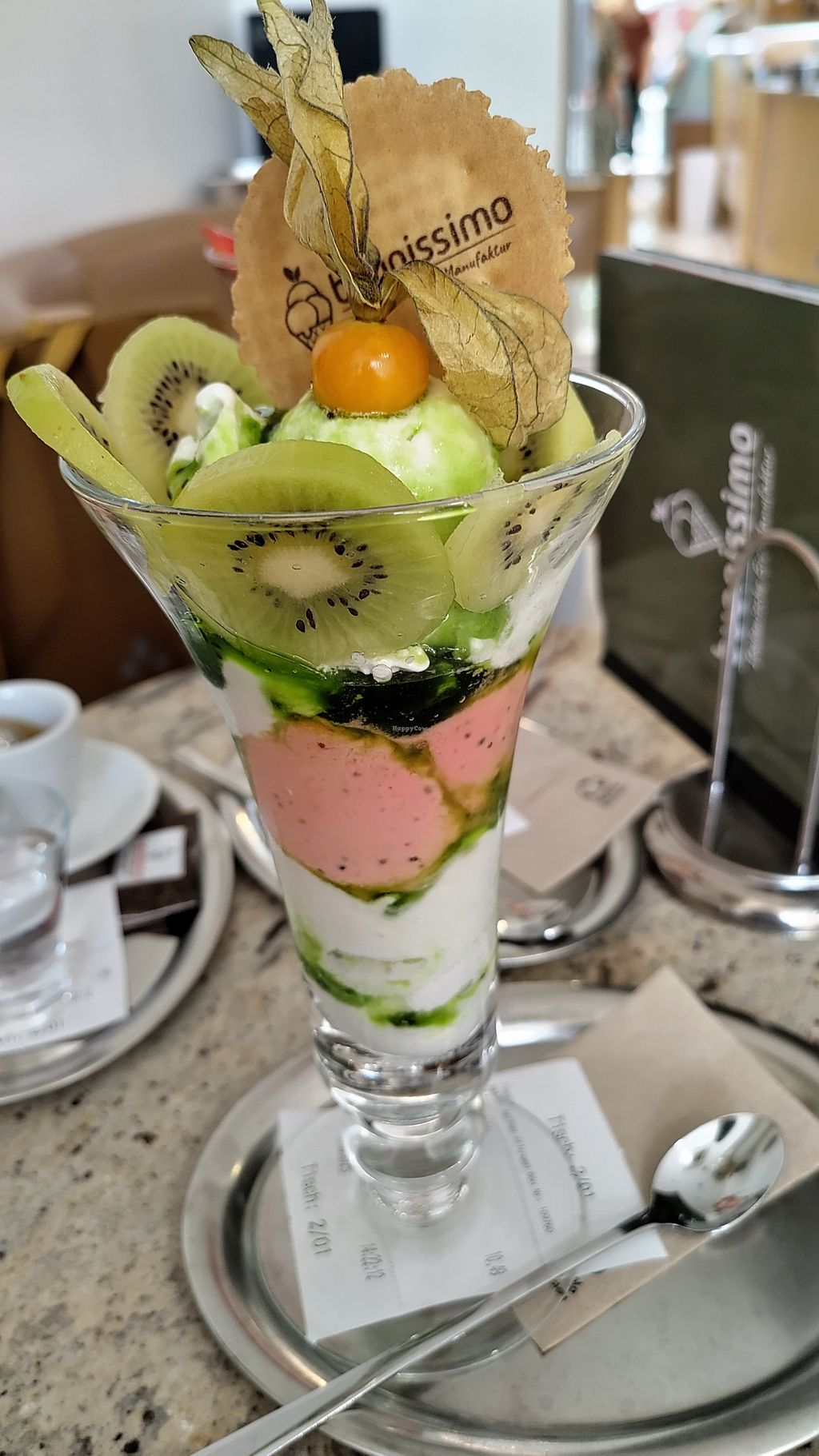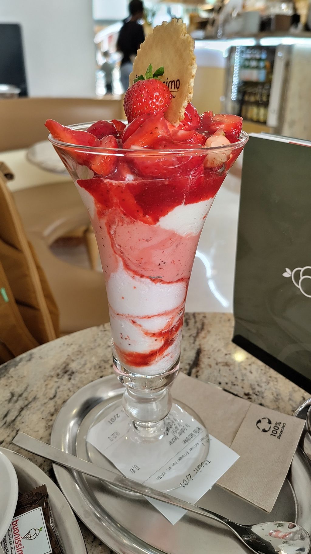 Today we ordered a vegan strawberry and a vegan kiwi ice cream cup. The ice cream was good, I especially liked the strawberry and lemon ice cream. All vegan options are clearly labeled in the menu as well as in the cooling counter.
