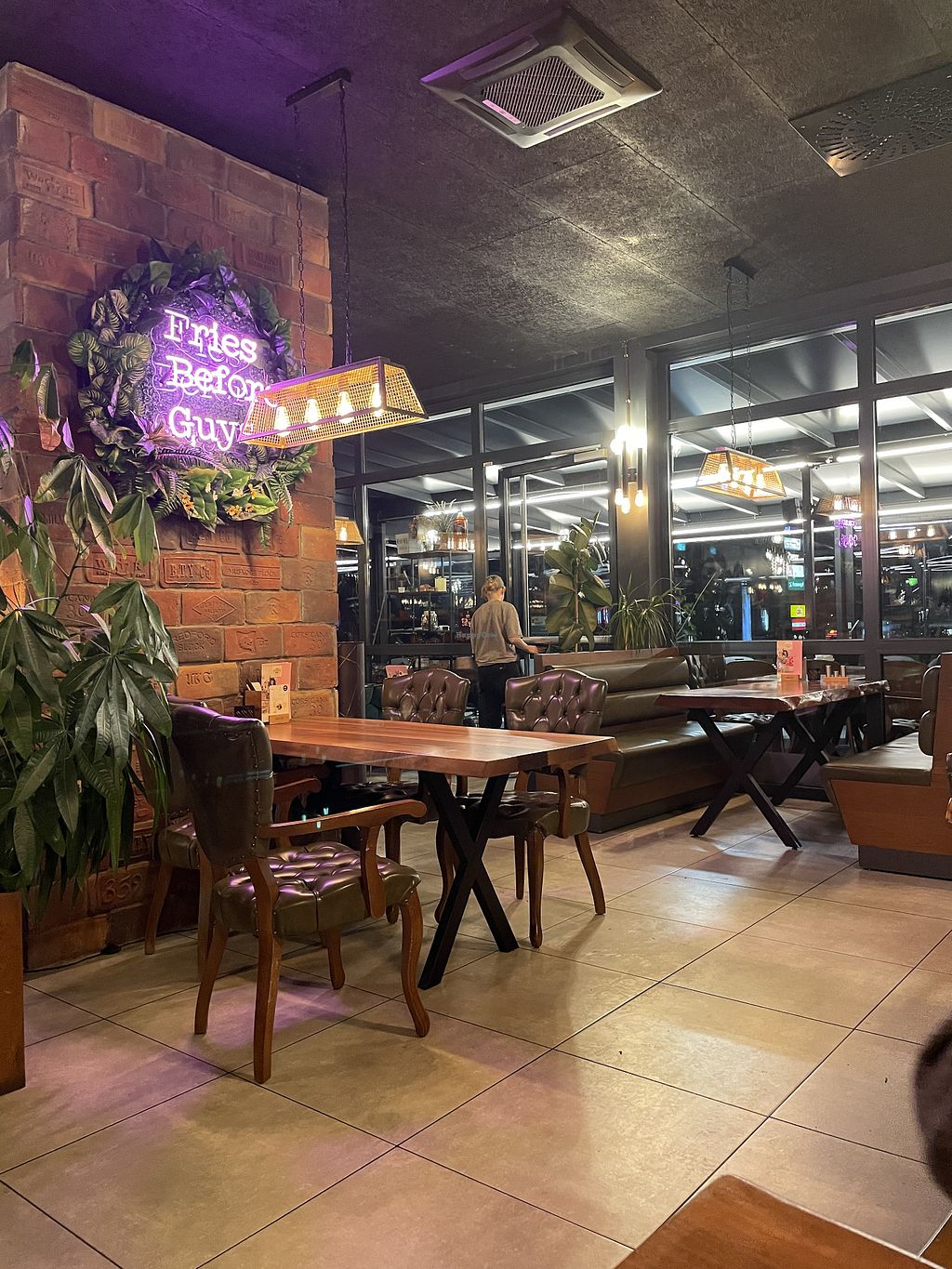 Serves meat, vegan options available. Burger restaurant serving burgers, bowls, and wraps. Vegan options are marked in writing and allergens are clearly listed for all dishes. Choices include several burgers, a vegan wrap, fries, burrito, and salads. Open Mon-Sun 11:00-22:00.