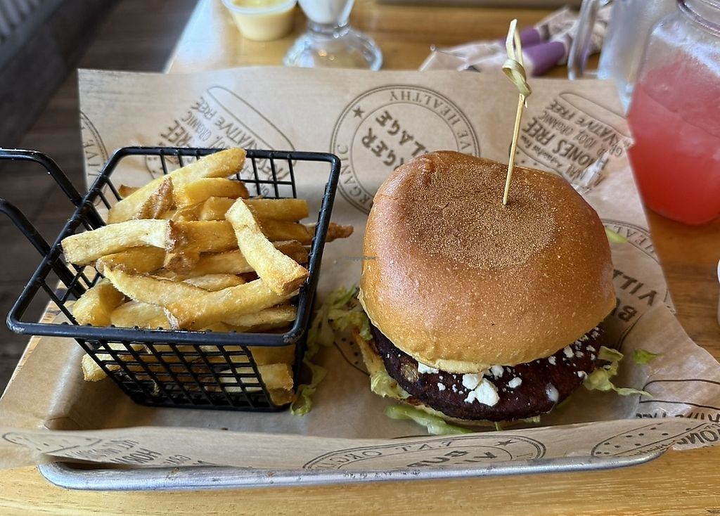 Village veggie burger with slippery puffball toppings, side of sweet p…