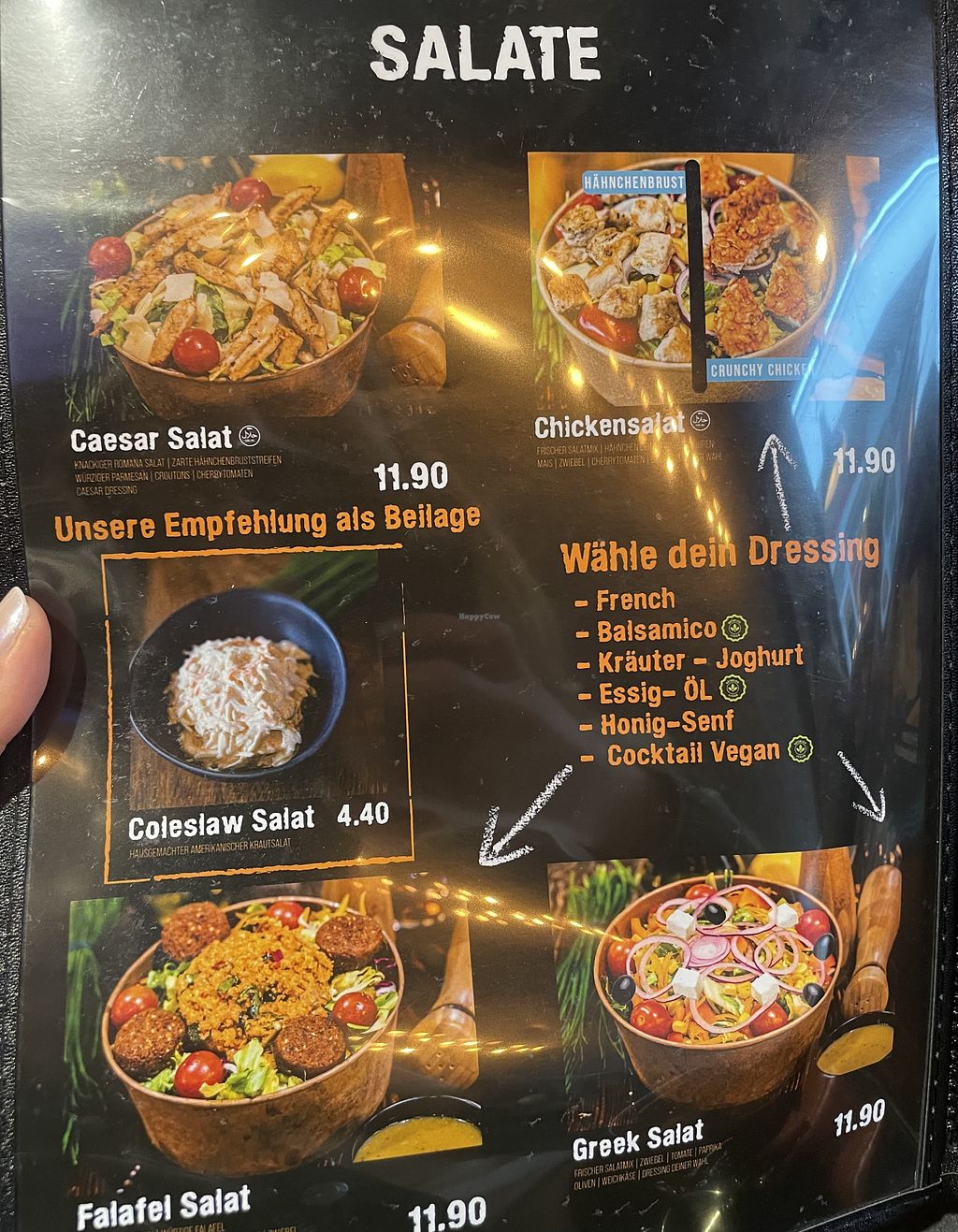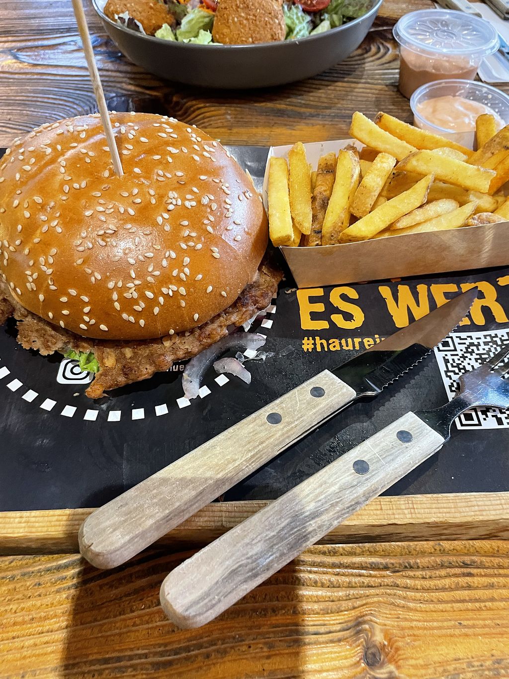 Leider sind die Chilli-Cheese-Pommes sowie die Hollandaise-Pommes nicht vegan, obwohl sie in der Karte entsprechend gekennzeichnet sind. Ansonsten gibt es einen veganen Burger mit Falafel-Patty. Es sind aber auch plant-based Patties erhältlich. Wir hatten außerdem den Falafel-Salat mit veganer Cocktailsauce – beide Gerichte waren lecker.