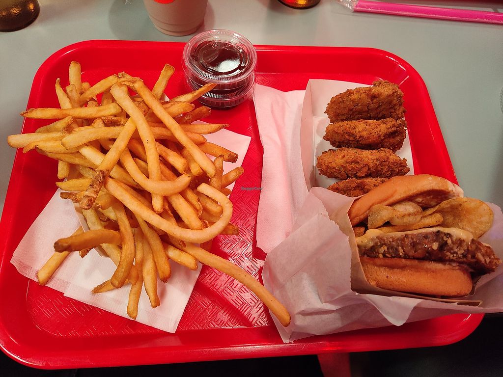 Brainburner burger, tofu nuggets, and fries