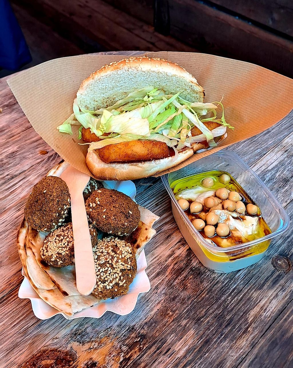 Serves meat, vegan options available. Burger and falafel joint with outdoor seating. Offers falafel, fries, and hummus. Also has vegan burgers with vegan buns, although they are not listed on the menu - ask staff for details. Open Mon 11:00-17:00, Wed-Sun 11:00-17:00. Closed Tue.