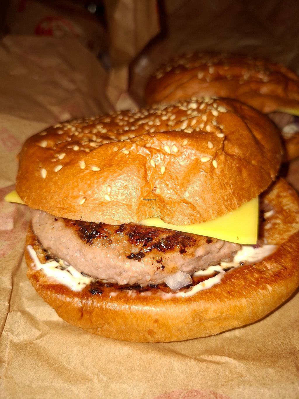 Serves meat, vegan options available. Burger restaurant offering around five different Beyond meat vegan burgers. Open Mon-Sun 1:00pm-12:00am.