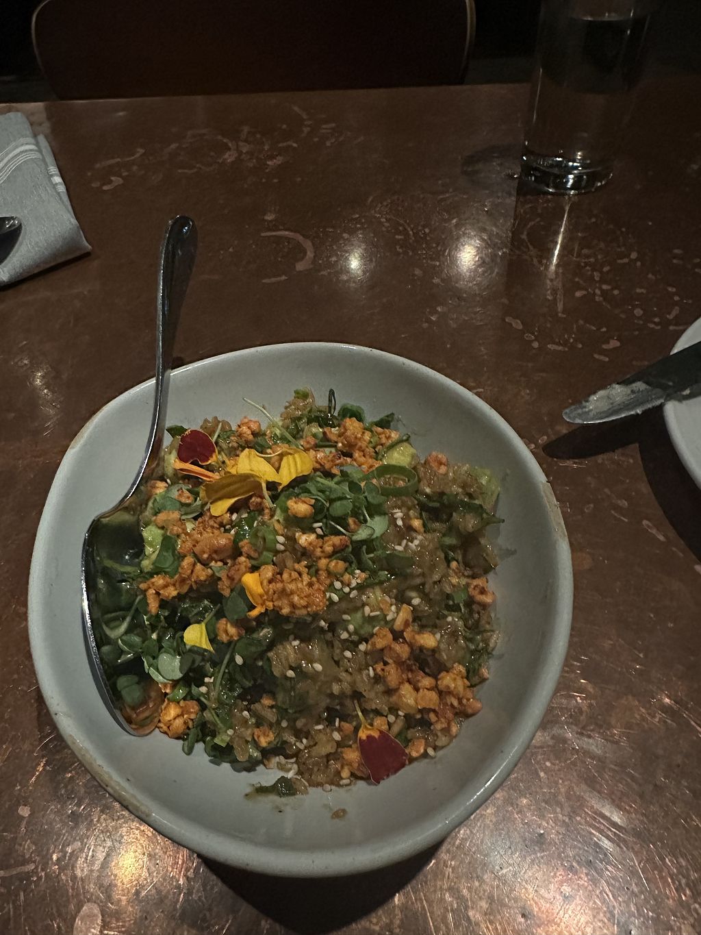 Warm pita bread, Avocado crispy rice, hummus, veggie plate, side of sc…