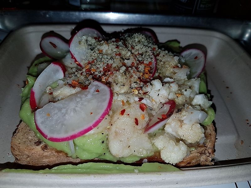 toast with guac and cauliflower and radish (strange combination!)