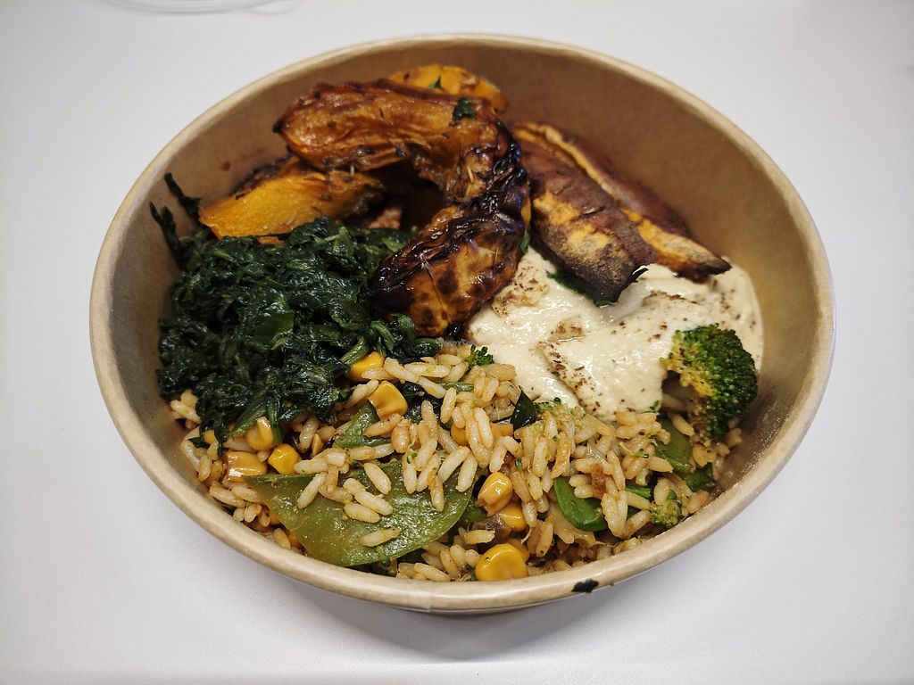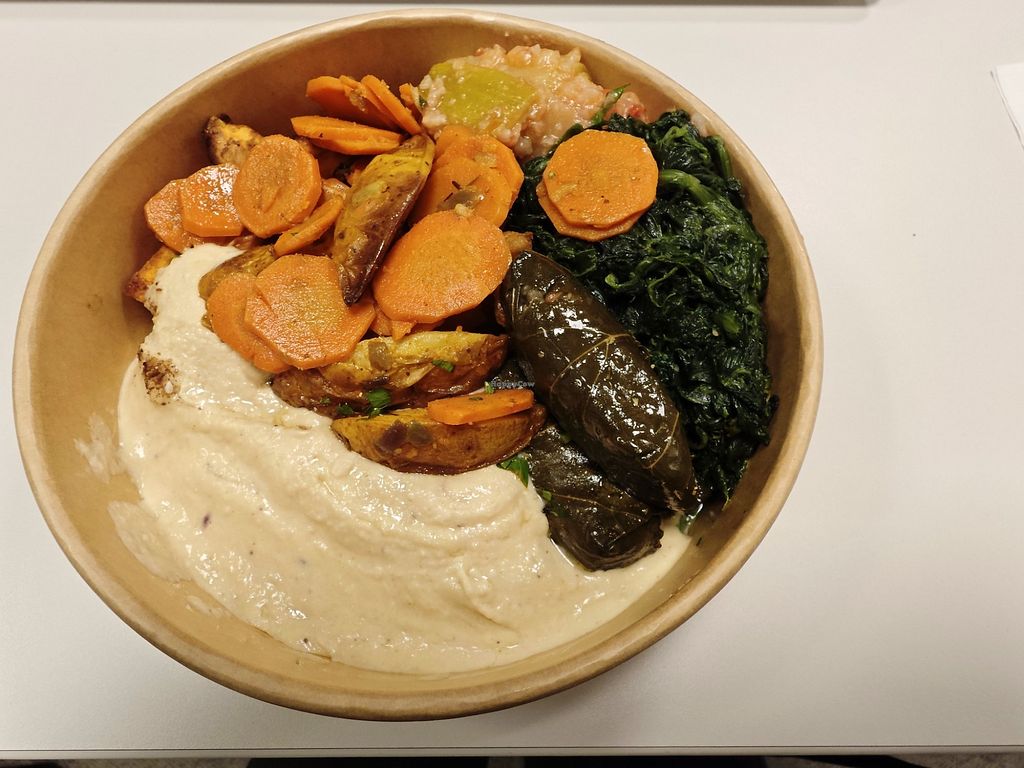 Serves meat, vegan options available. Salad bar with customizable, made-to-order salad bowls. Example vegan add-ins and toppings include quinoa, rice, potatoes, seasonal vegetables and more. Open Mon-Thu 11:00-15:00. Closed Sun & Fri-Sat.