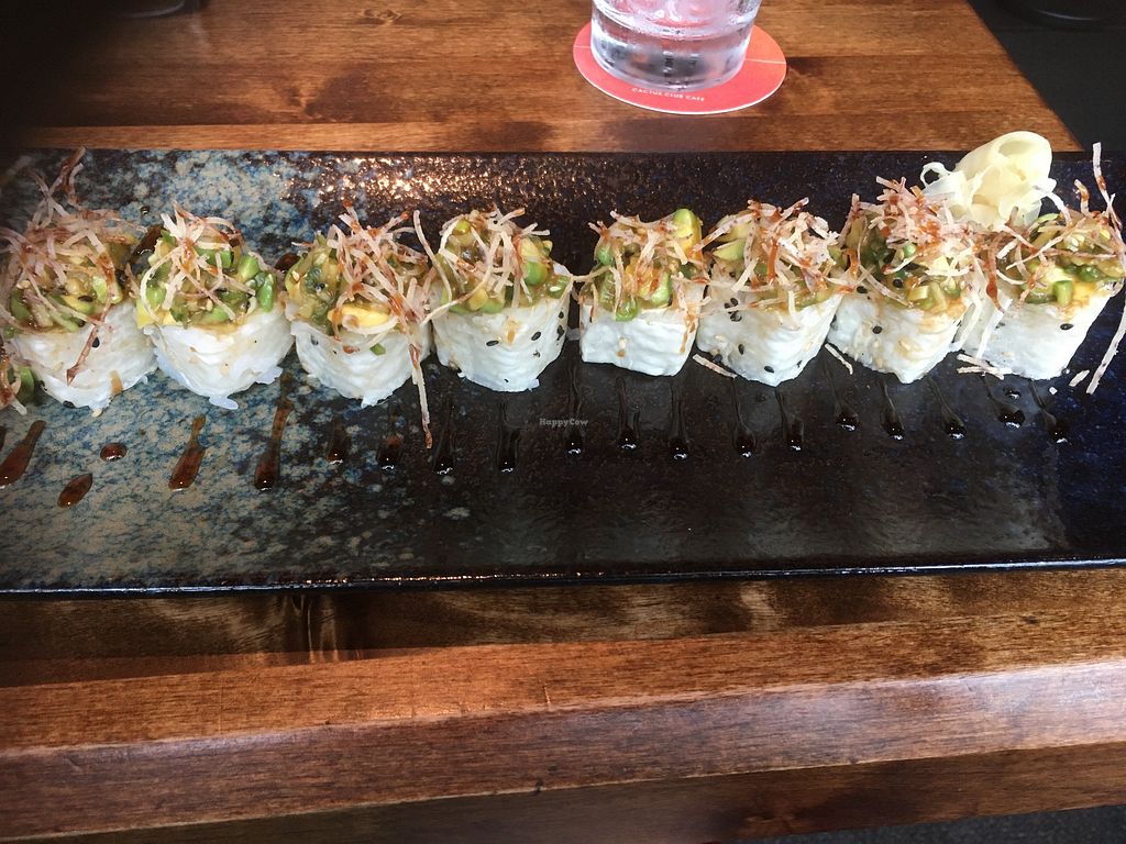 My employer decided to hold this year’s staff event at Cactus Club Cafe. I was pleased to see a huge improvement in the menu since the last time I was there many years ago. At that time, the server told us items on the vegetarian menu could not be veganized. On their current menu they had 2 items marked as vegan. One item was a sushi “Zen” roll that I took to be an app based on the price. My boss was paying so I went for the crispy tofu bowl. It was delicious. Lots of spicy tofu on top of rice, veggies and avocado. The rice to veggie proportions were excellent. I say that since I feel some places serve way too much rice without sufficient toppings. Their wine list also had vegan wines marked. I would definitely eat there again if the opportunity arises. Update. Stopped for lunch and had the sushi. It was great! Not traditional (no seaweed) topped with avocado and mango. Very tasty.