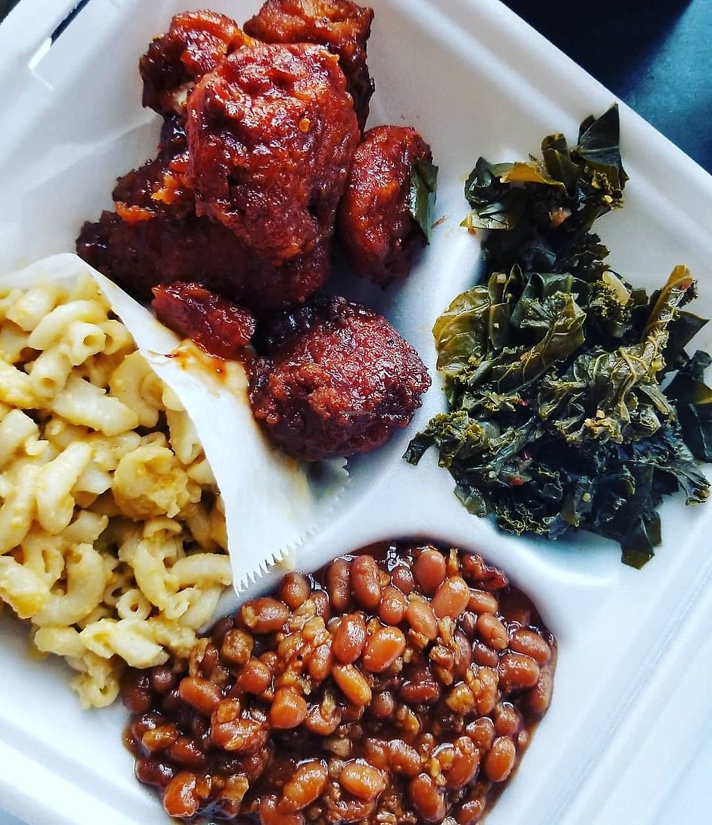 Vegan mac, vegan bbq cauliflower, vegan greens, vegan baked beans