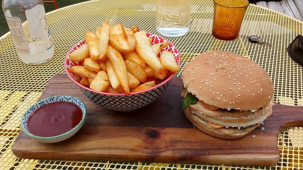 Bright, friendly atmosphere. Very reasonably priced food. We had the schnitz burgers which came with a generous portion of hot chips with sauce. It was simple and very tasty. The staff were very friendly and enthusiastic. Good coffee. They stock ethical drinks like the karma cola range. Loved the dog-friendly, kid friendly courtyard area.