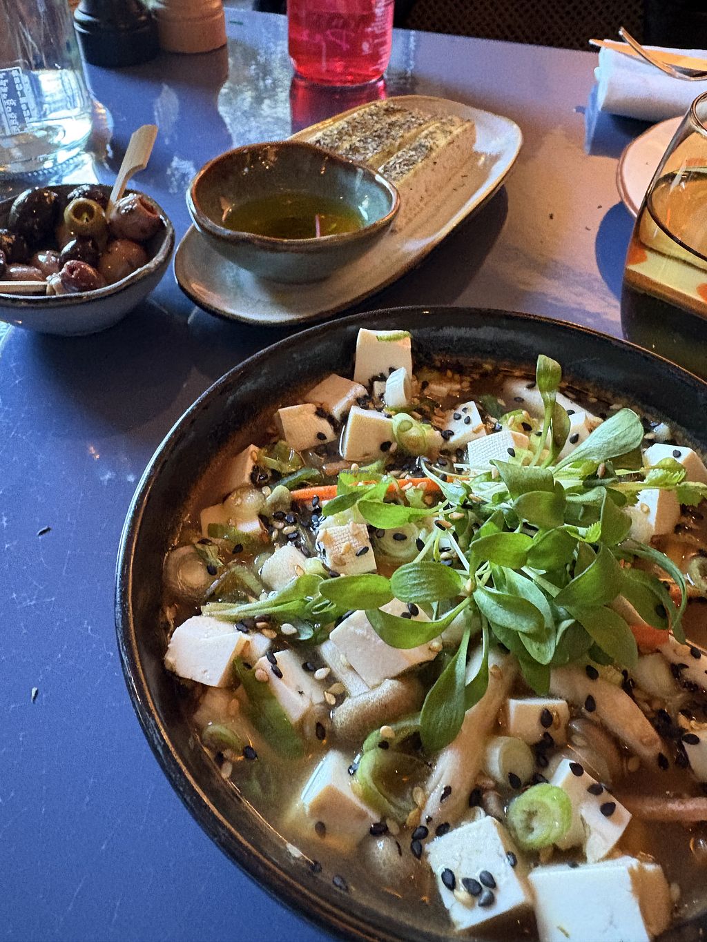 I had a delicious ramen with tofu and noodles - and asked for no egg- very yummy. Great bread, olive oil and olives too
