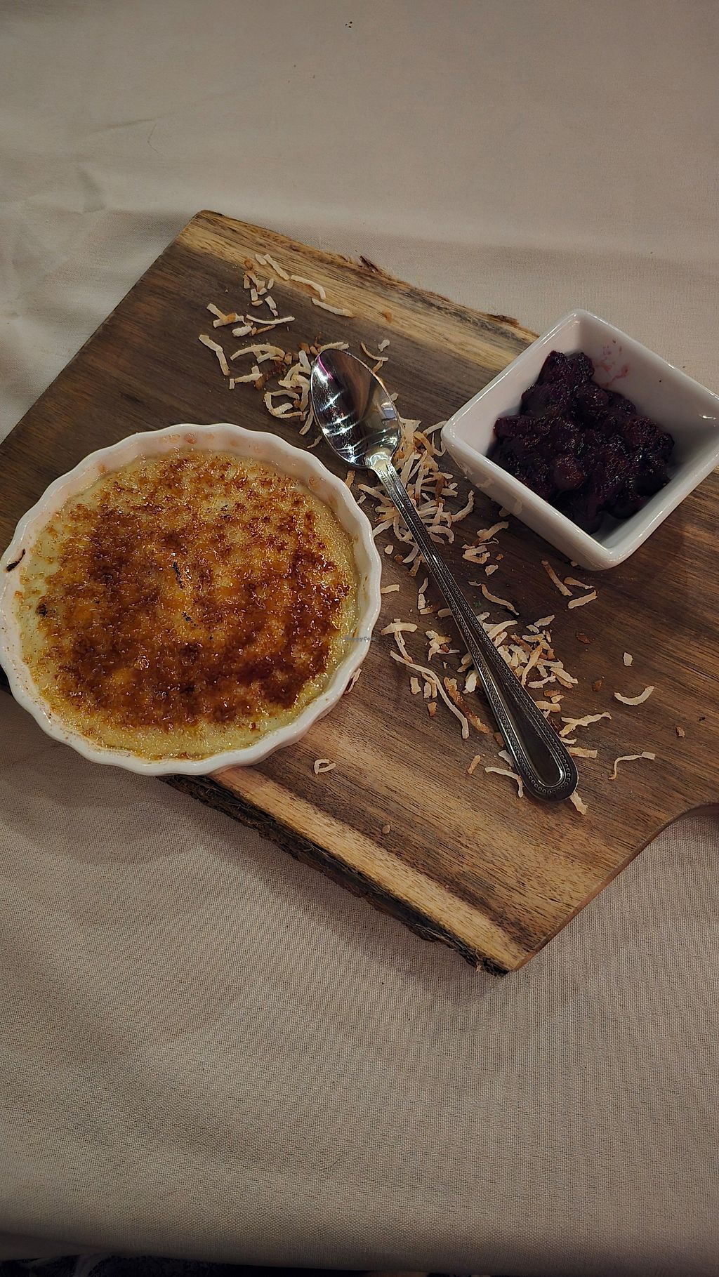 Super impressed with the quality and care that went into crafting the vegan items on their menu. I wanted to try everything, but I ended up just eating the free bread and garlic olive oil and the gochujang tofu on a bed of veggies. The sauce for the tofu was so good, and they give you a thick slice. I ate half of it to save room for dessert, a vegan creme brulee. This might have been the first time since I went vegan that I have eaten creme brulee, and it was exactly how I remembered. In addition, they had live music. Truly a must-go if you are in the area. Vegan or not.