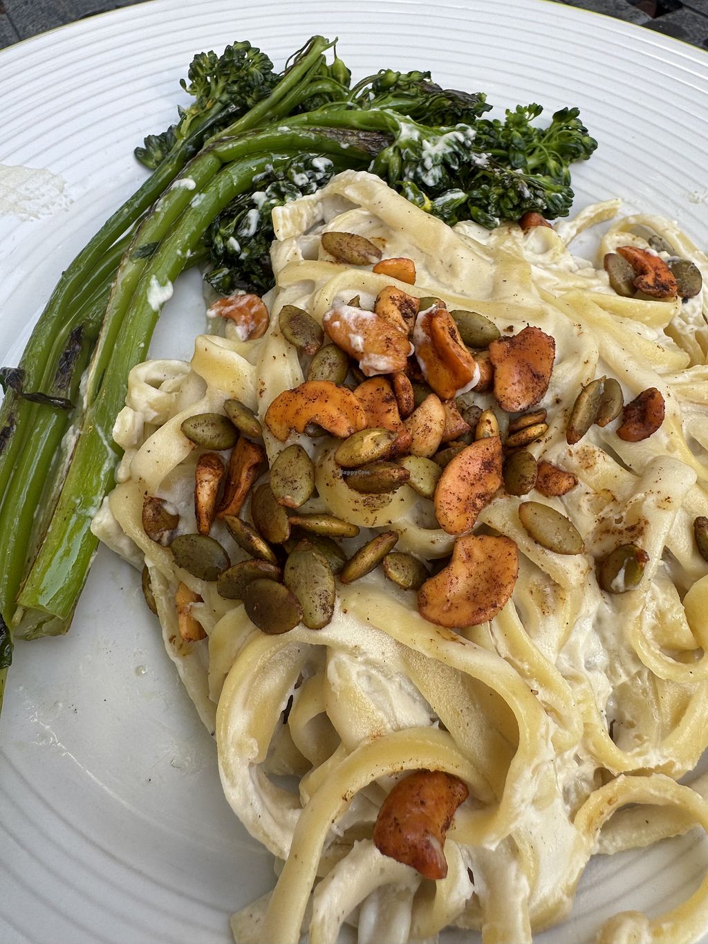 Bonnie and I celebrated our wedding anniversary at Cafe Aroma. We enjoyed two pasta entrees, both clearly marked on the menu with "pbv" for plant-based vegan options. Friendly service, very pleasant experience. A bit pricey, but good quality.
