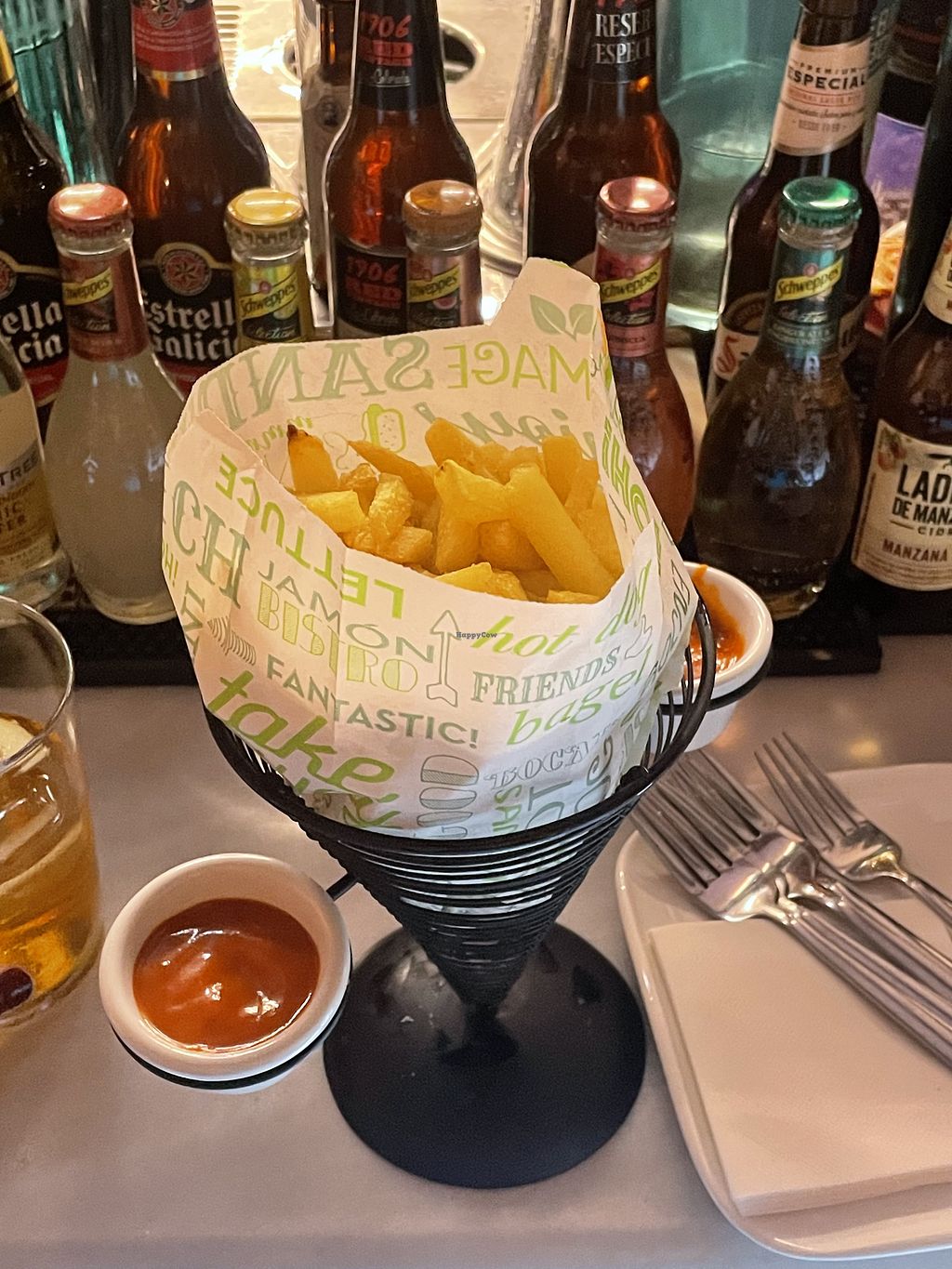 Cool bar and restaurant. Few fegan options but considering the area it’s a lot. Only tried potatoes with brava sauce but they also had a burger!