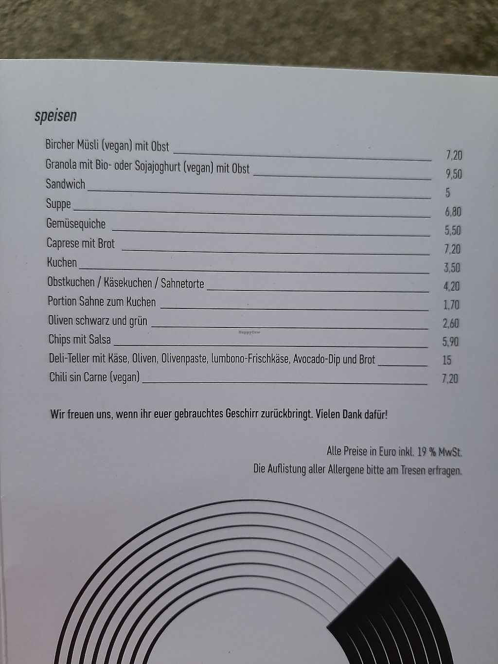 Vegetarian cafe with vegan items such as chilli sin carne, cakes, bircher müsli, granola with soy yoghurt and more. Open Mon 09:00-18:00, Wed-Thu 09:00-18:00, Fri 09:00-22:00, Sat-Sun 09:00-18:00. Closed Tue.