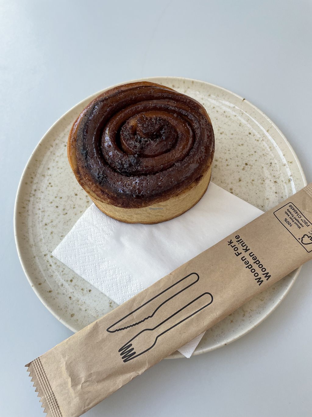 Small specialty coffee shop inside a library offering plant-based milk for drinks and three clearly labeled vegan pastries: cinnamon roll, almond croissant and pistachio roll. Open Tue-Fri 09:00-19:00, Sat 10:00-18:00. Closed Sun & Mon.