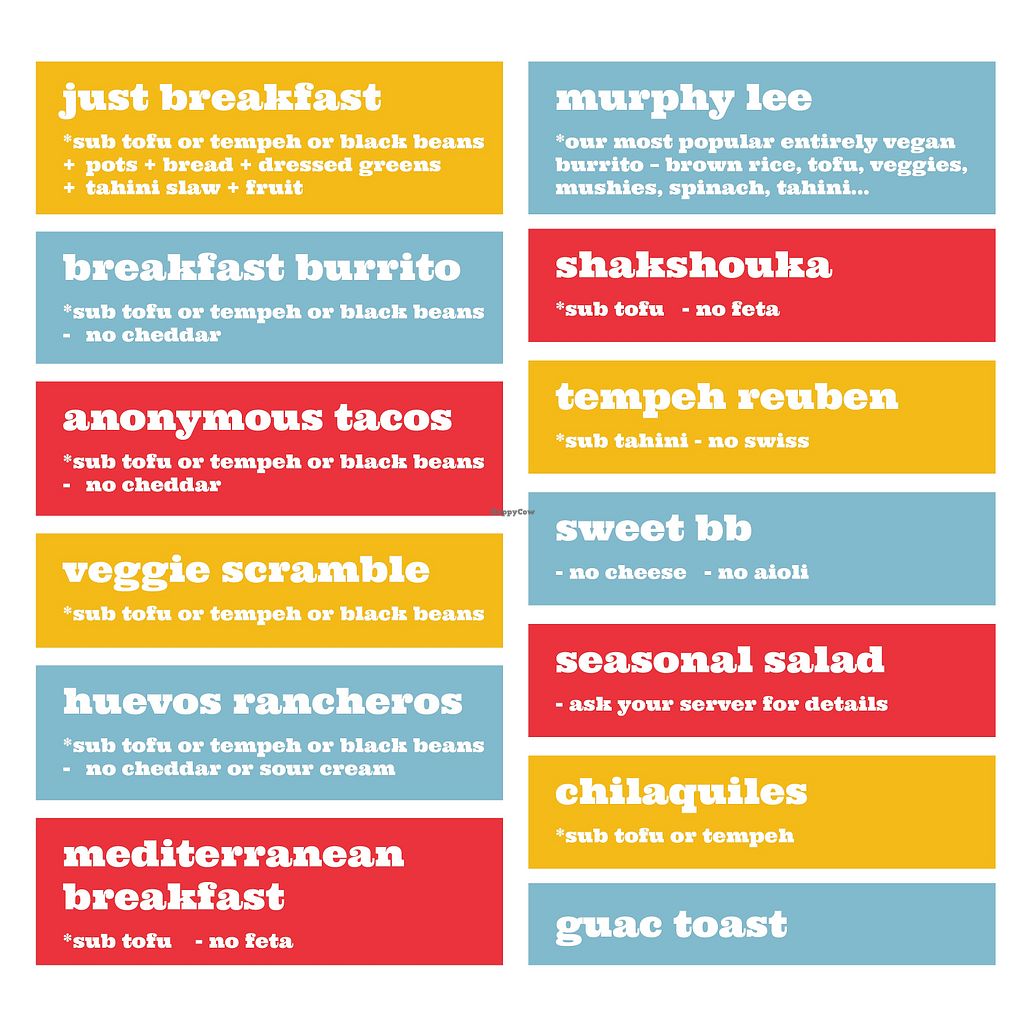 Went above my expectations! You can sub most meals for tempeh and tofu. Vegetarian sausage is not vegan however. Potatoes were REALLY delicious. I got the breakfast wrap and subbed tofu for eggs and tempeh for protein. Fiance got the tempeh Ruben which was delicious. Ask for bread to not be buttered. Murphy Lee is vegan as is. Tons of vegetarian options.