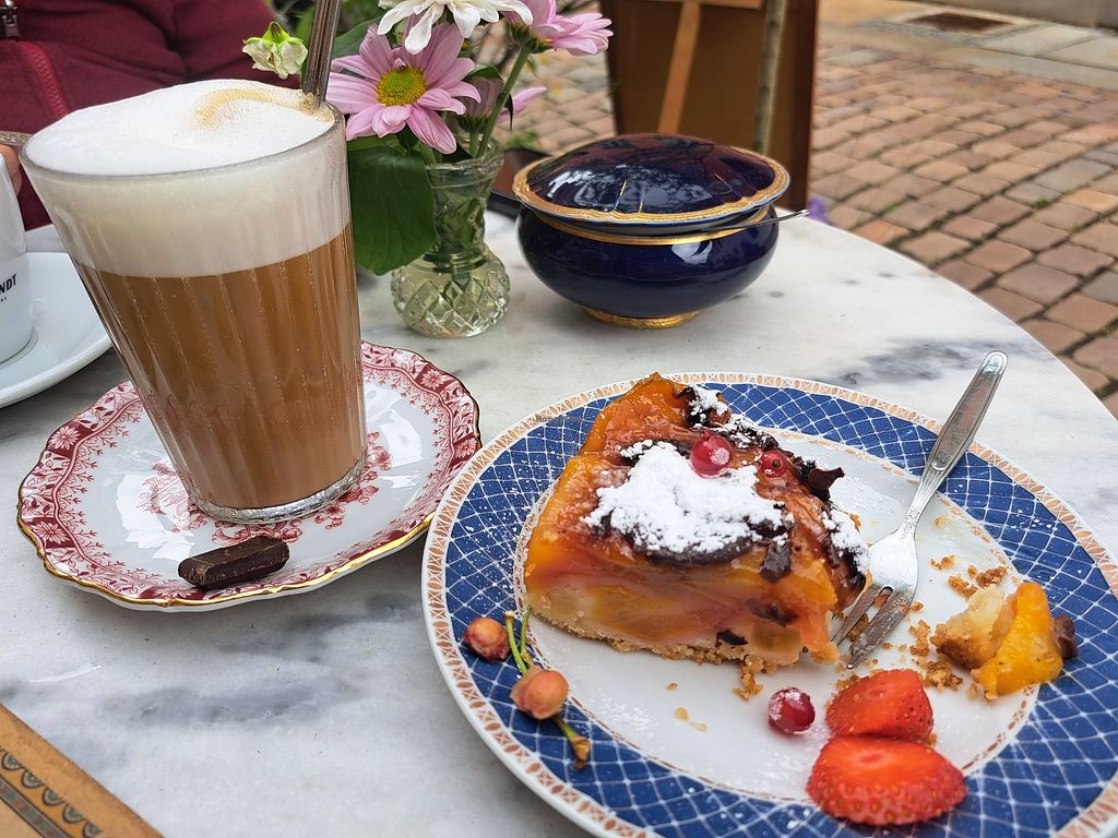 Vegan apple crepe and tea with vegetable milk.