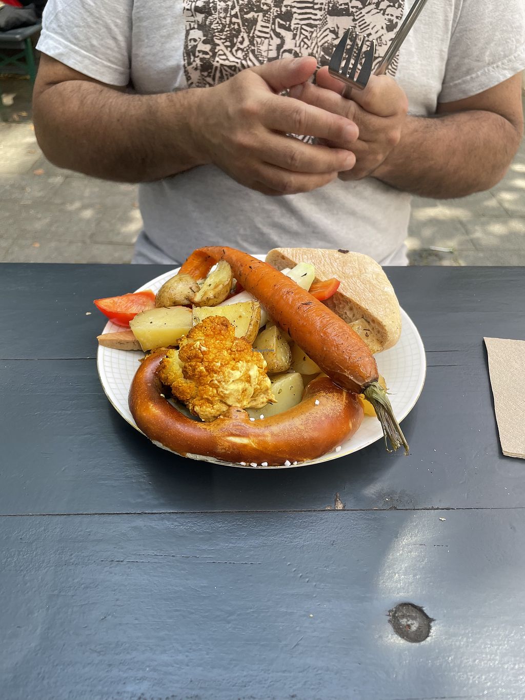 As they are currently not allowed to serve a buffet brunch you get a selection on a plate served at the table. The vegan option was very disappointing. Although it was decorated nicely it was a boring piece of tofu, a slice of Aldi sausage (which I like) and two homemade spreads which I didn‘t really like. No scrambled tofu instead of eggs or anything else hot which I expect at a brunch for 18€ (without drinks except a glas of orange juice). For vegetarians the choice of cheese looked much better, but still not extraordinary.
