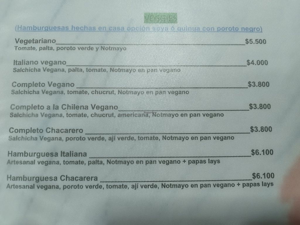 Tuve la oportunidad de pasar 2 veces a comer y probamos el italiano vegano, completo a la chilena vegano y completo chacarero vegano..todo muy rico, recomendadisisisimo