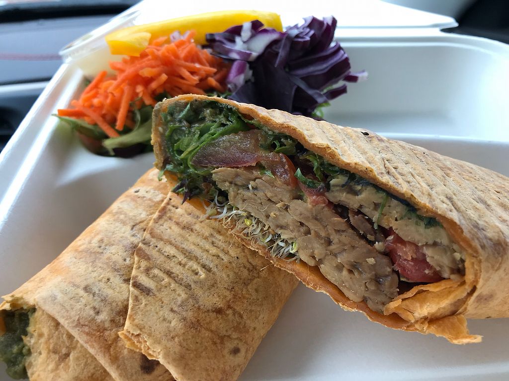 Assiette mexicaine (tofu brouille, haricots noirs, muffin sale de mais…