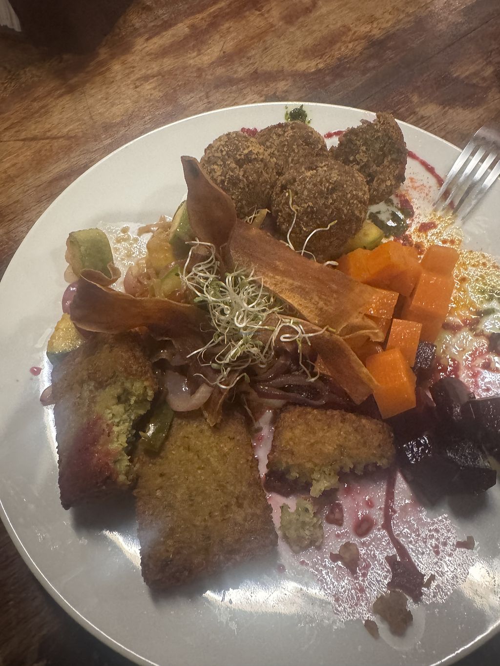 Nice platter with falafel squares & black bean balls with veg, photo is half eaten as I nearly forgot! It has no eggs or yoghurt! Also very cute dogs