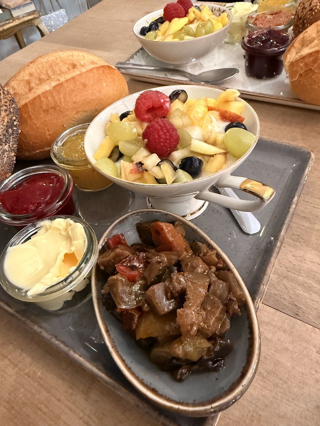 Amazing European-style breakfast with at least 8 spreads both sweet and savory. Bread that felt like a cloud and delicious drinks. Had a lebkuten latte and walnut torte as well. The decor is precious and I picked up some stocking stuffer gifts after eating.