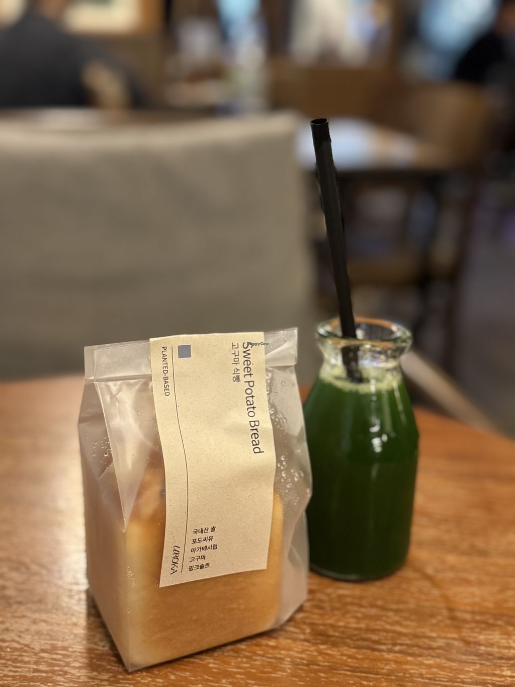 Read moreGot freshly squeezed pear kale juice that is bottled in glass jar and Sweet Potato Bread Loaf to take home.