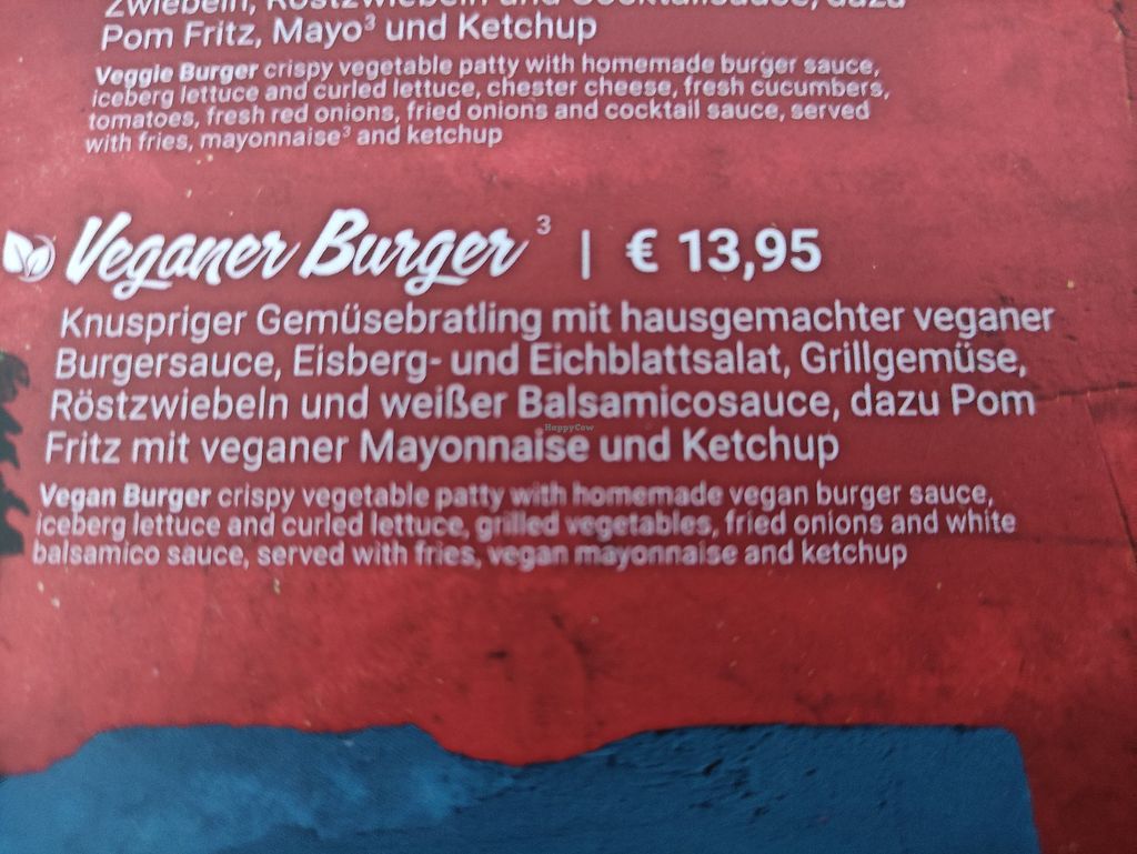 Read moreVorsicht: die Trüffel-Pommes sind auf der Burgerkarte als vegan gekennzeichnet, kommen aber mit nicht-veganer Trüffelmajo und Parmesan. Also vegane Pommes-Option bleiben da nur die normalen Pommes und Süßkartoffelpommes.