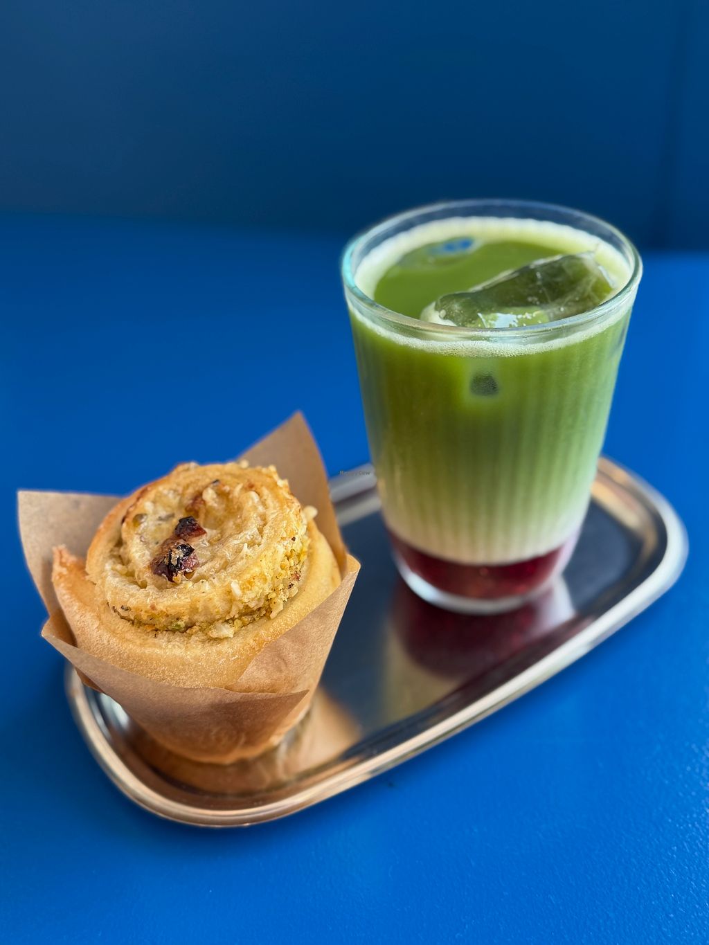 oat iced matcha and bacon cheese savory roll (all vegan, ofc)